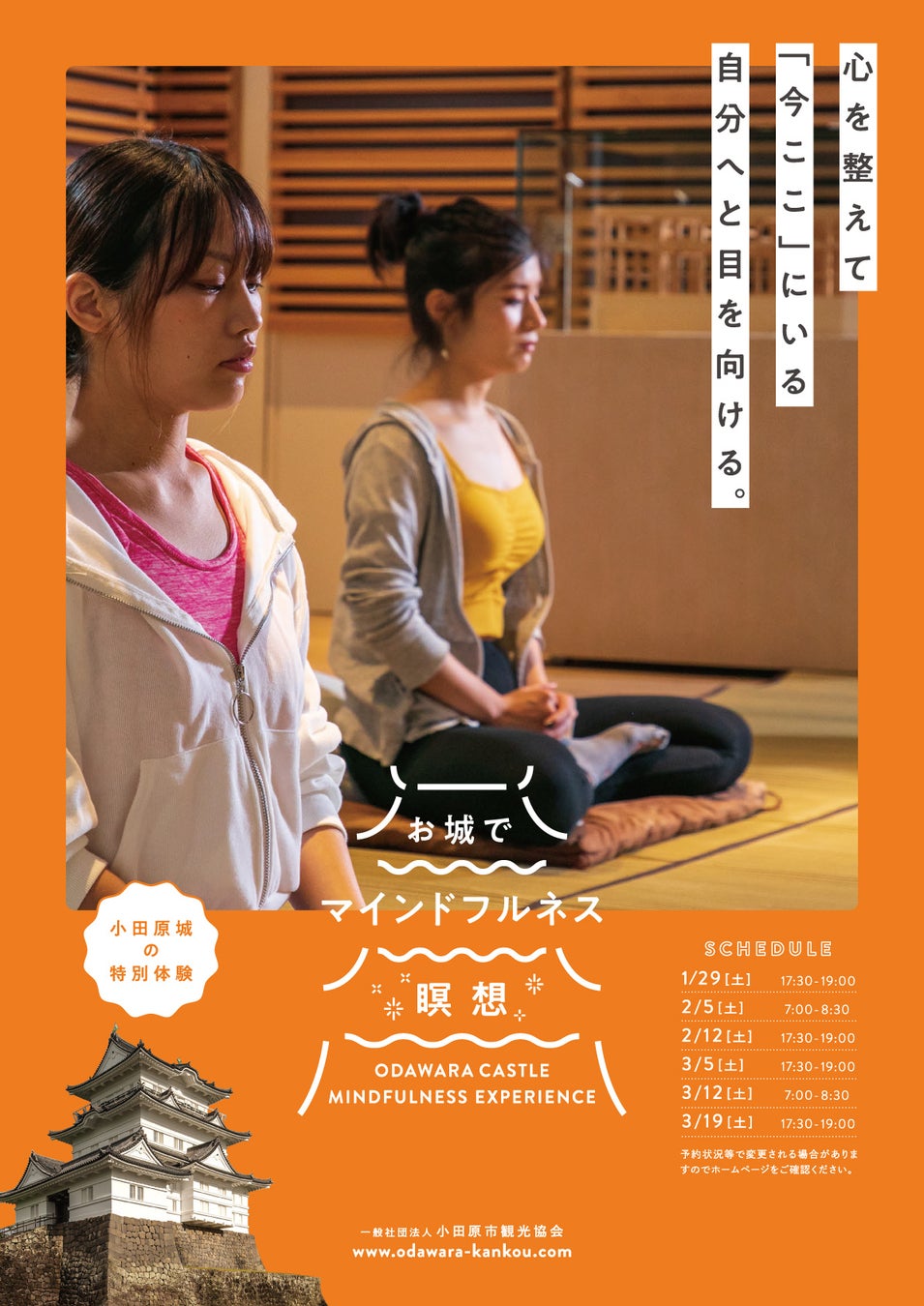 一般社団法人小田原市観光協会(神奈川県小田原市)は、小田原城天守閣を特別利用した新たな体験プログラム 『お城でマインドフルネス瞑想~小田原城の特別体験~』 を開始しました。本企画を通じて、小田原城を活用した新たな観光コンテンツを提供するとともに、日本に来られない世界の方々にも小田原の魅力を発信していきます。