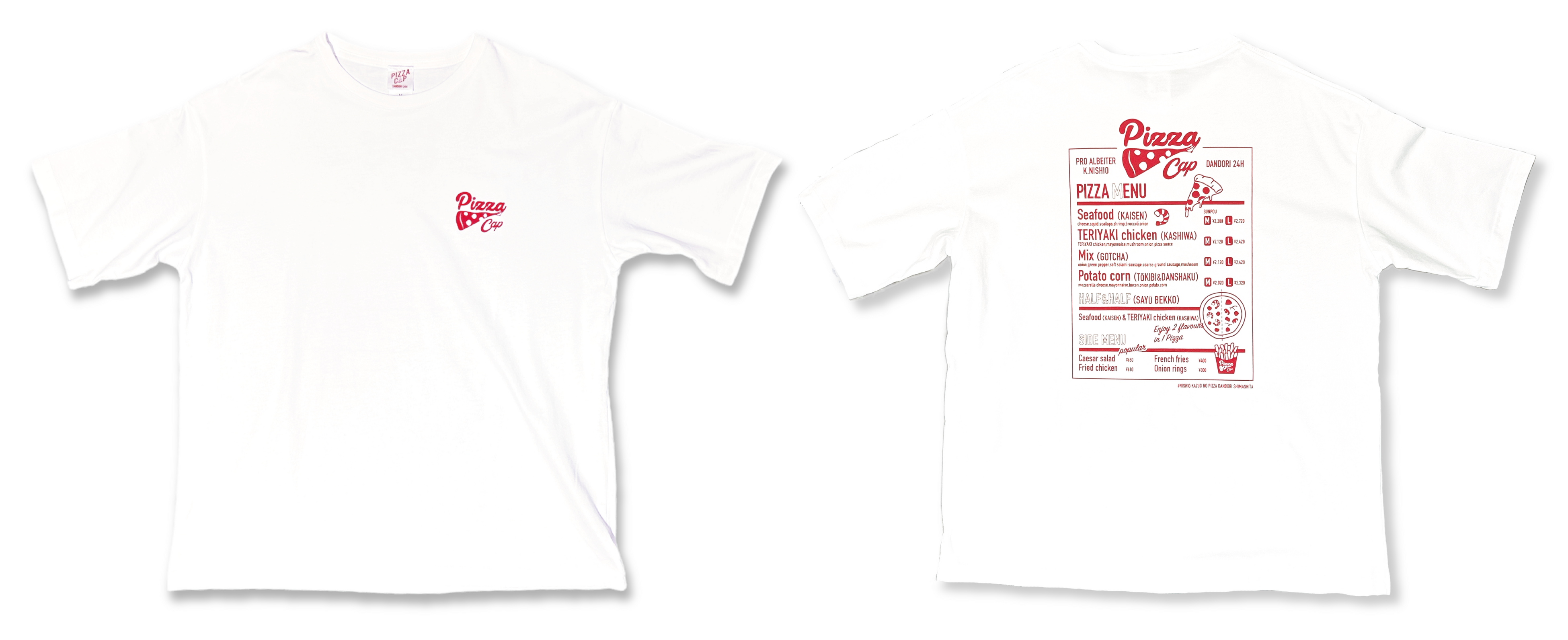バックプリントにPIZZA CAPのメニューがデザインされた、ビッグシルエットTシャツ。
