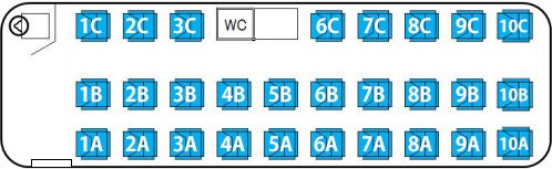 3列独立シート、トイレ、座席仕切カーテン、USB電源ポートまたはコンセント
