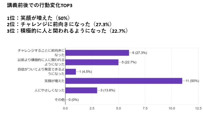 この講義を受けた学生たちからは「自分に似合うスタイルが分かったことで、前向きになれた」 「メイクを学び、自分に自信が持てるようになった」などの外見・内面ともに変化があったとの声が寄せられています。90%を超える学生が自己肯定感の向上を実感し、半数以上の学生が「笑顔が増えた」と回答。わずか1年間で学生たちの表情だけでなく、人間関係や積極性にも変化の兆しがみられ、外見理解が内面の成長を促す新たな教育アプローチとして注目を集めています。