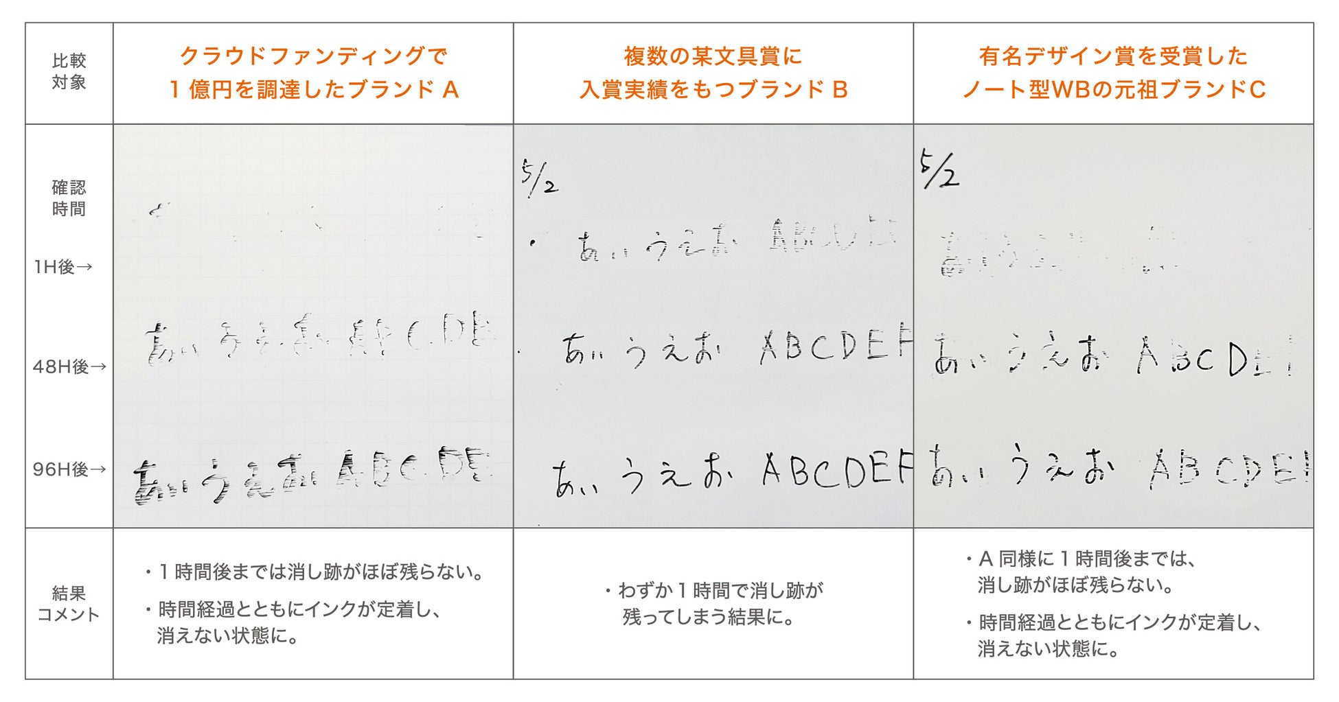 他社のホワイトボードと比較して、「wemo paper flip board」がいかに消し跡が残らないかをテストしました。