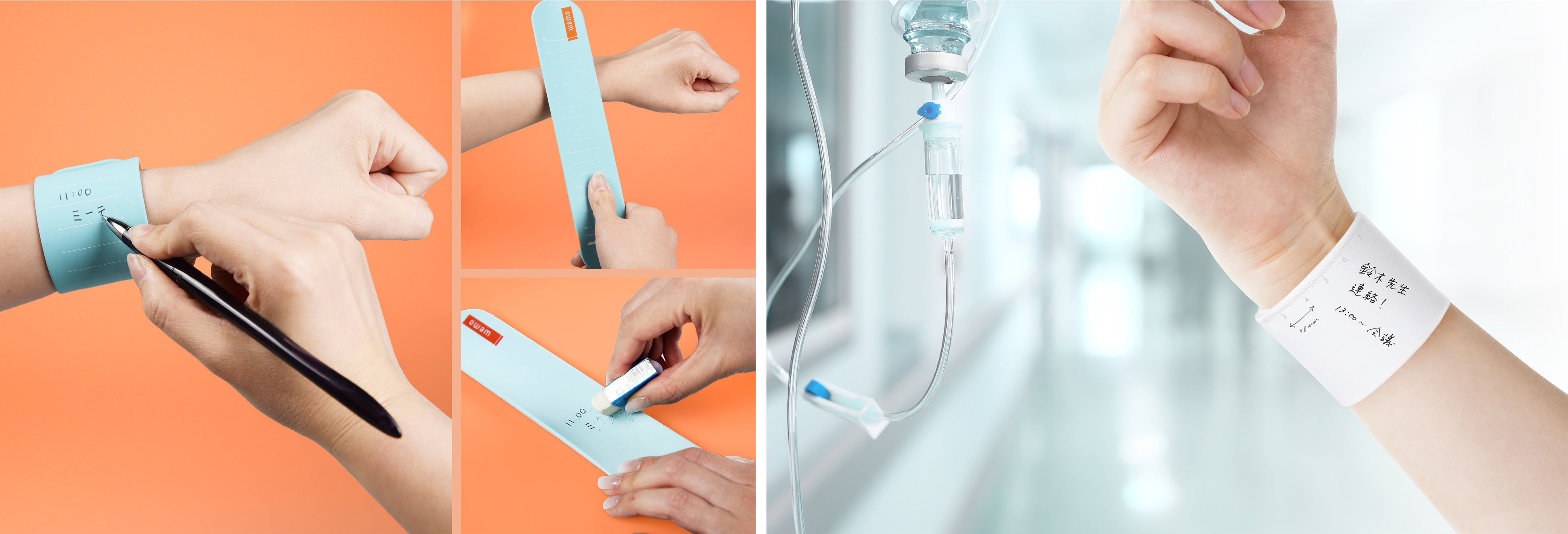 油性ボールペンで書いて、消しゴムや指で消せるウェアラブルメモです。大切なことを忘れないために手や腕にメモを書いてしまう、せっかく取ったメモを紛失してしまう等「記憶に対する物理的/精神的なストレス」を軽減するために誕生しました。肌に直接メモしている看護師さんの手をみかけたことがwemo開発のきっかけです。美しい手に書かざるを得ない状況を何とかしたい、その一心でデザインしました。油性ボールペンで繰り返し書いて消せるだけでなく、濡れても消えないため屋外や水中での作業にも使用できます。wemoバンドタイプは2018年の”日本文具大賞 機能部門優秀賞”と“グッドデザイン賞”をはじめ国内外のアワードを受賞。