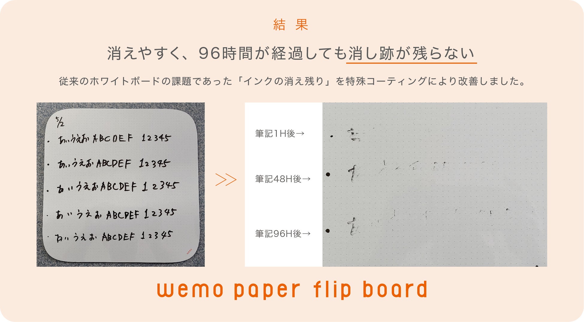 従来のホワイトボードは「インクの消え残り」が問題でした。wemoテクノロジーを活用し、消しやすく時間が経っても消し跡が残らないように改善しました。専用ペン&イレーザーが付属。