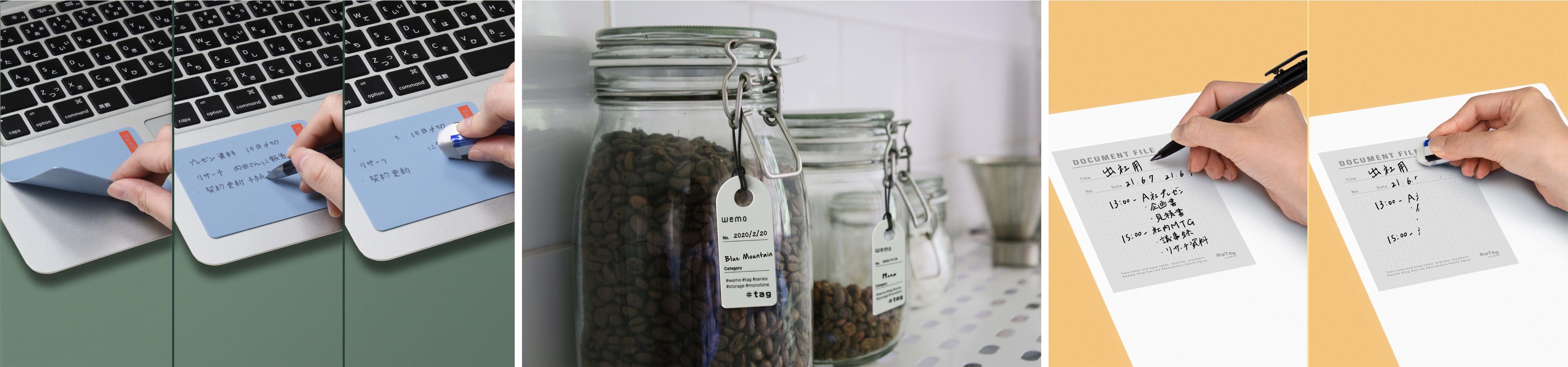 バンドタイプ・パッドタイプ・ケースタイプ・IDカードホルダーの4種をご用意、目的やTPOに合わせて選ぶことができます。2021年3月には、油性マーカーで書いて消しゴムで消せるポリカーボネート製の「wemo#tag」シリーズを発売しました。さらに、2021年8月に、使い捨てることが前提であったクリアファイルの常識を覆し、油性マーカーで繰り返し書いて消せるドキュメント収納アイテム「ReTag by wemo」を発売しました。「脱・使い捨て」のサステナブルかつ便利なアイテムです。
