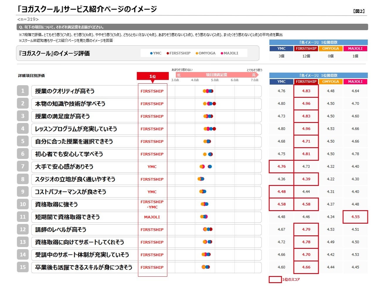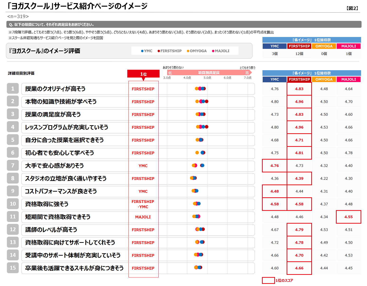各ヨガスクールのサービス紹介ページのイメージでは、1位を得た項目数で『FIRSTSHIP』(12項目)がトップ、『YMC』(3項目)、『MAJOLI』(1項目)と続きました。
