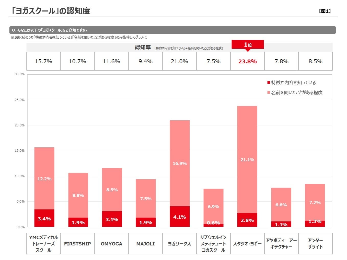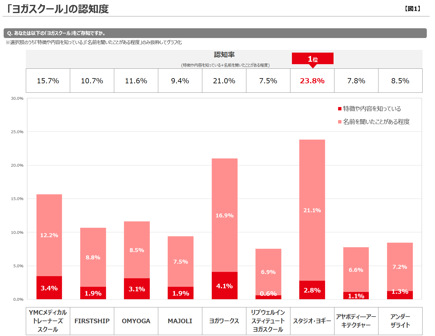 全国の20~59歳女性への事前調査で、認知(特徴や内容を知っている+名前を聞いたことがある程度)されているスクールトップは 『スタジオ・ヨギー』(23.8%)。次いで『ヨガワークス』(21.0%)が2位、『YMCメディカルトレーナーズスクール(以降、YMC)』(15.7%)、『OMYOGA』(11.6%)の結果となりました。【図1】