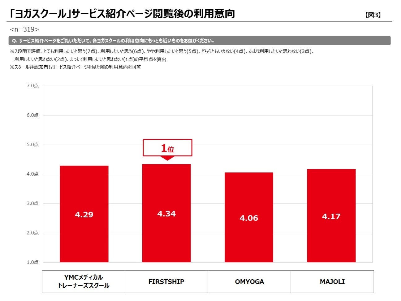 各ヨガスクールのサービス紹介ページ閲覧後の利用意向では、『FIRSTSHIP』(4.34pts)が利用したいと思うスクール1位に。次いで『YMC』(4.29pts)、『MAJOLI』(4.17pts)と続きました。【図3】