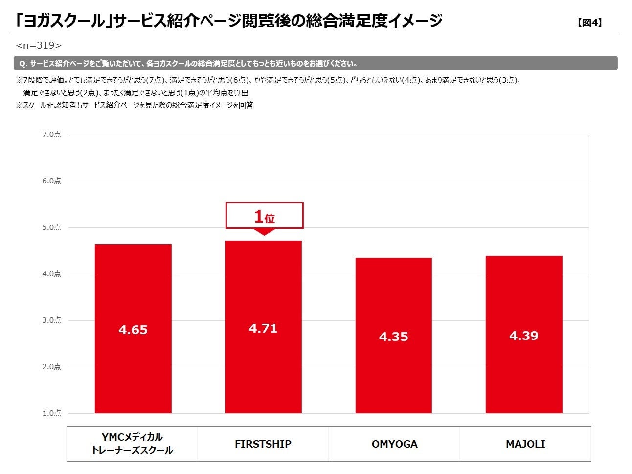 各ヨガスクールのサービス紹介ページ閲覧後に、各スクールを利用すると仮定した場合の総合満足度を聴取した質問でも、『FIRSTSHIP』(4.71pts)が1位、次いで『YMC』(4.65pts)、『MAJOLI』(4.39pts)となり、利用意向に続き、もっとも満足度が高そうなスクールとしても『FIRSTSHIP』が選ばれました。【図4】