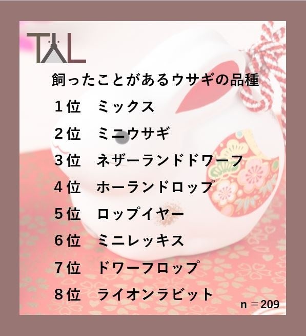 ウサギを飼っている方・飼ったことがある人209名に対し、「飼ったことがあるウサギの種類を教えてください」と質問したところ、1位がミックス、2位がミニウサギ、3位がネザーランドドワーフ、5~8位は、ホーランドロップ、ロップイヤー、ミニレッキス、ドワーフロップ、ライオンラビットという結果になりました。