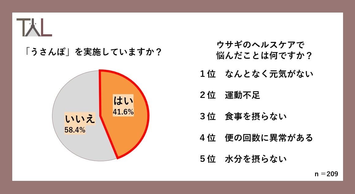 ウサギを飼っている方・飼ったことがある人209名に対し、「ヘルスケアのためにうさんぽ(ウサギとの散歩)を実施していますか?」と質問したところ、約4割の飼い主が実施していることが分かりました。「ウサギのヘルスケアについて悩んだことは何ですか?(複数回答可)」という質問に対して、もっとも悩みが多かったのは「なんとなく元気がない」で、2位~5位は、運動不足、食事を摂らない、便の回数に異常がある、水分を摂らない、という結果となりました。