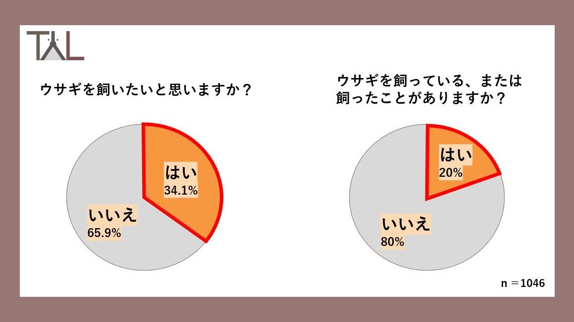 20代~50代男女1046名に対し、「ウサギを飼ってみたいと思いますか?」と質問したところ、34.1%の人が「はい」と回答しました。そのなかでも20代は、半数の50%の人がウサギを飼いたいことが判明しました。また、「ウサギを飼っている、または飼ったことがありますか?」という質問に対し、20%が「はい」と回答しました。5人に1人がウサギを飼ったことがあることが分かりました。