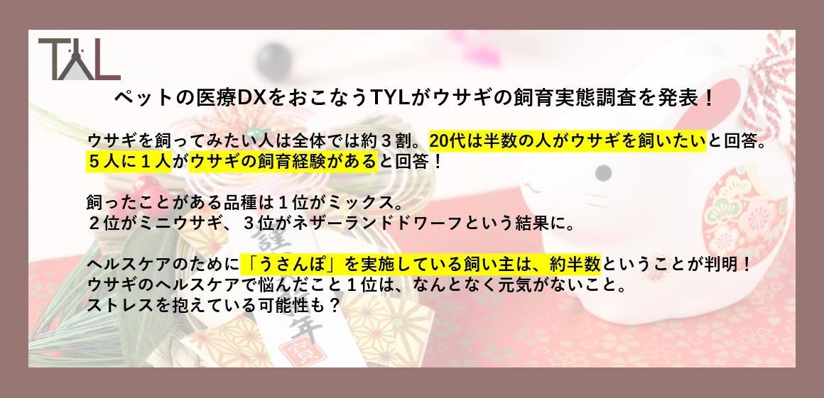 ペットの家族化推進をミッションとしペット医療DXをおこなう株式会社TYL(本社:東京都港区 代表取締役:金児 将平、以下TYL)は、卯年を迎えるタイミングに合わせて1046名に対しウサギに関する飼育実態調査をおこないました。