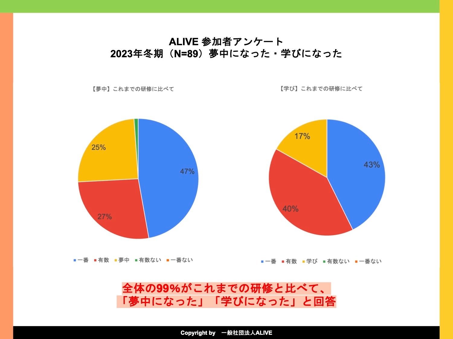 これまでの研修に比べて、「夢中になりましたか?」「学びになりましたか?」という設問に対して、全体の99%が「夢中になった。」「学びになりました。」と回答頂きました。また、約2人に1人がこれまでの研修で1番夢中になったという結果になりました。