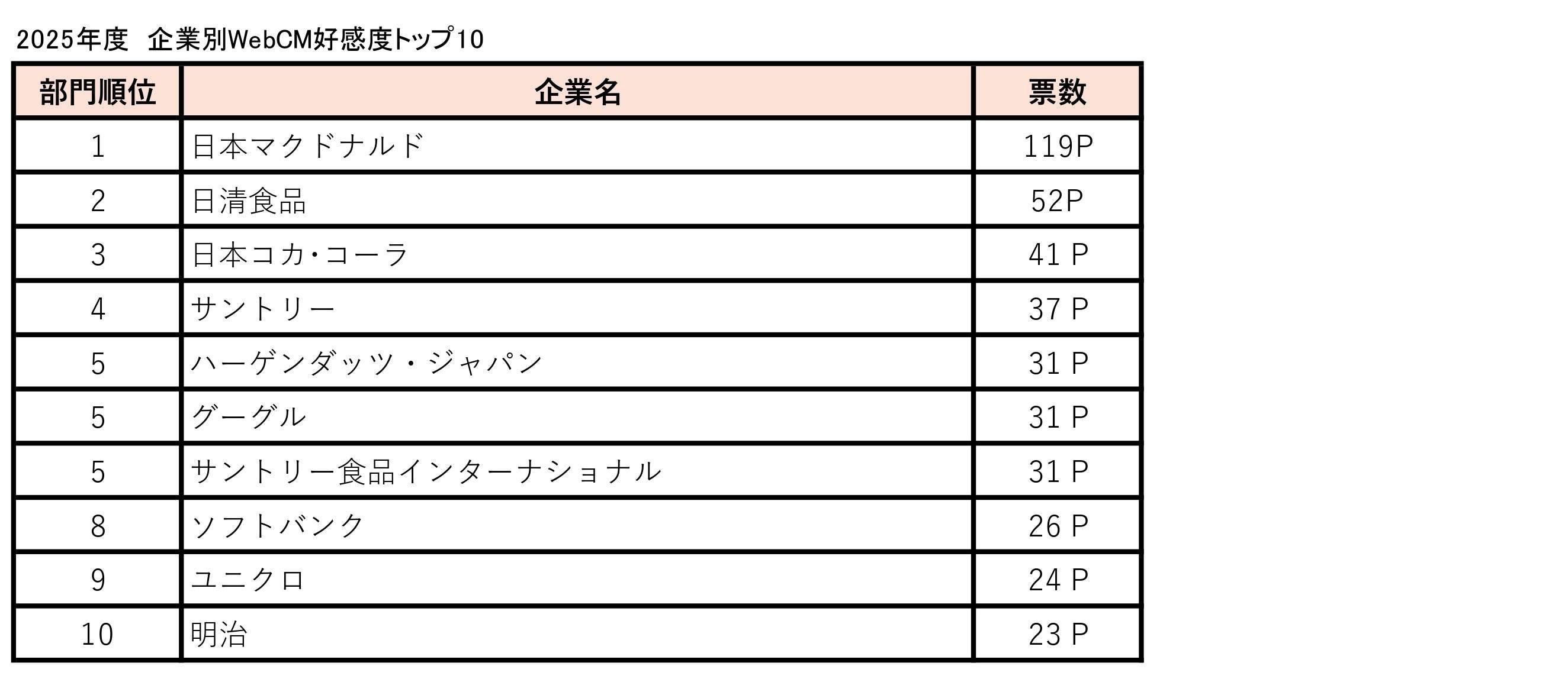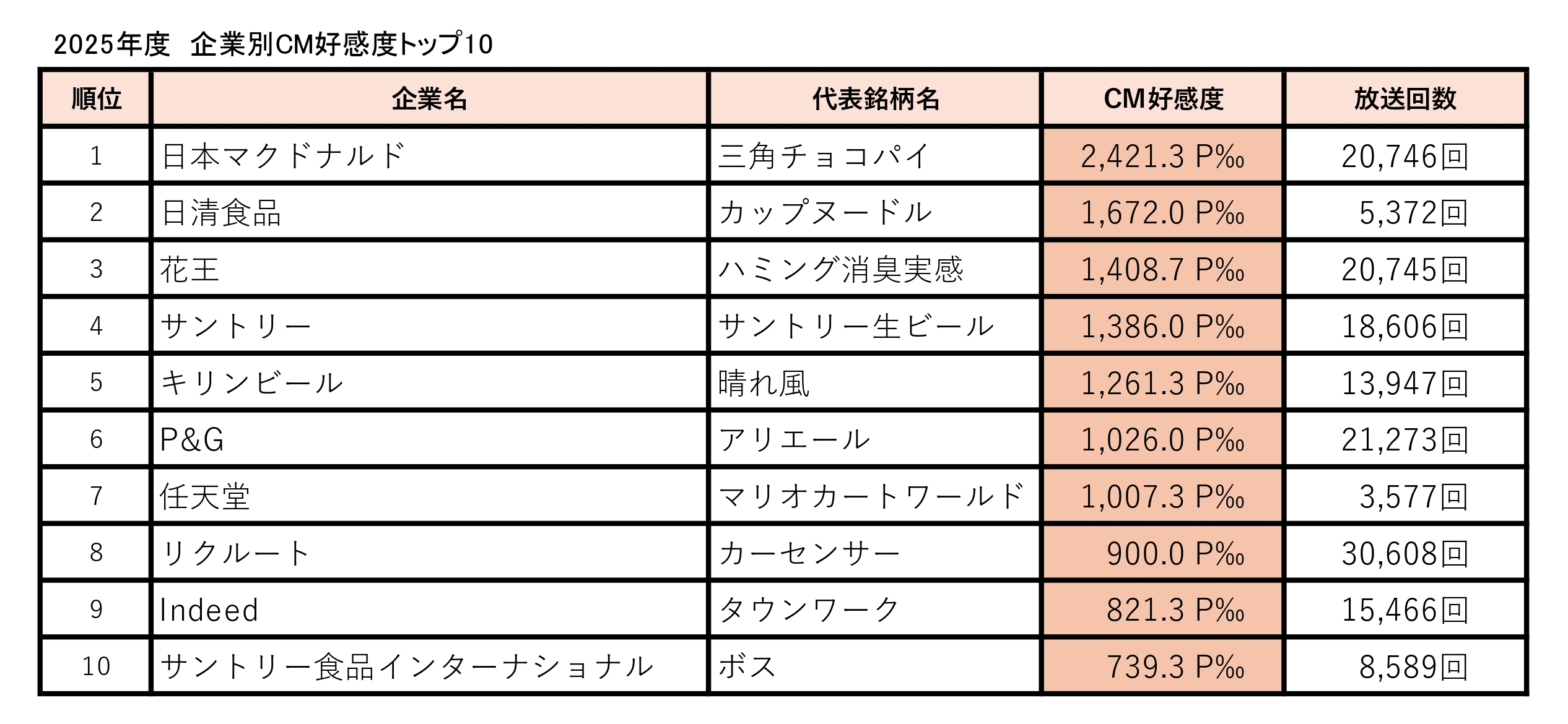 2025年度の企業別CM好感度総合1位は日本マクドナルド(全49銘柄・128作品)で、4年連続の首位に輝いた。HANAのNAOKO、CHIKAがそれぞれ伊藤沙莉とキレのあるダンスをする『三角チョコパイ』、柳楽優弥と宮﨑あおいが出演した『月見ファミリー』、多部未華子が登場する『コク旨ビーフデミグラコロ』などのCMがヒット。これらの期間限定商品とともに『ビッグマック』といった定番商品のCMも好評で、幅広い世代の支持を集めた。