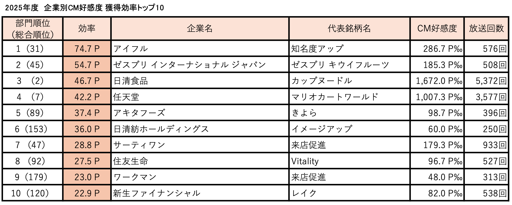 「企業別CM好感度 獲得効率」部門:CM好感度で総合200位以内に入った企業のうち、オンエア100回当たりで獲得したCM好感度(=効率)が高い順にランキング