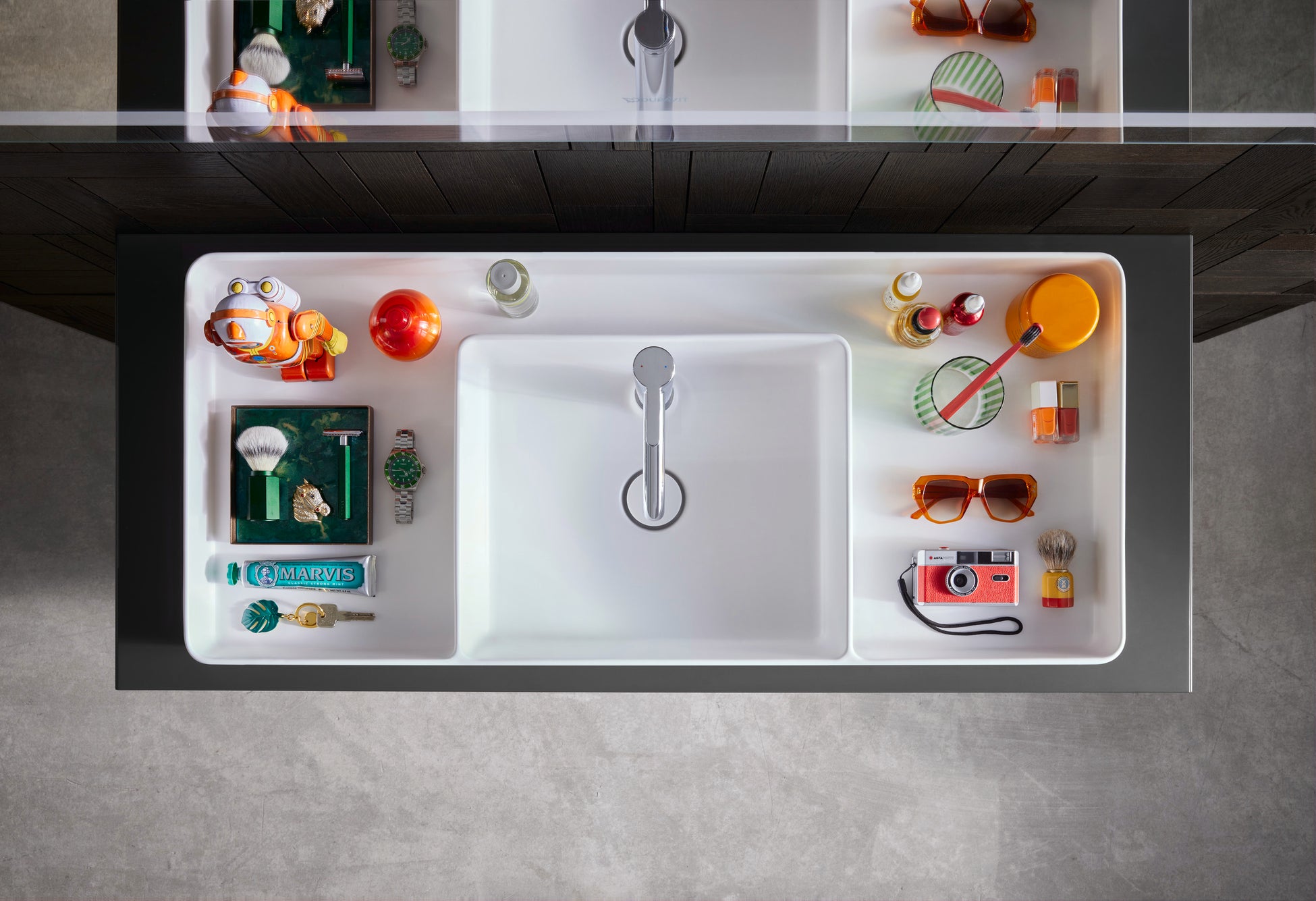 ゆったりとした洗面ボウルは、周囲に実用的なストレージエリアを確保しているため、小物やアクセサリーなどをすぐ手の届くところに置くことができます。 DuraCeram®(デュラセラム)を使用したØ460mmのラウンド型や550mm~1040㎜の長方形に加え、新素材DuroCast UltraResist(デュロキャスト ウルトラレジスト)を使用した1140mmと1340mmのダブル洗面ボウルなど幅広いサイズを展開。カラーはホワイト(DuraCeram®のみ。抗菌釉薬HygieneGlaze付き)とホワイトサテンマットの2色からお選びいただけます。