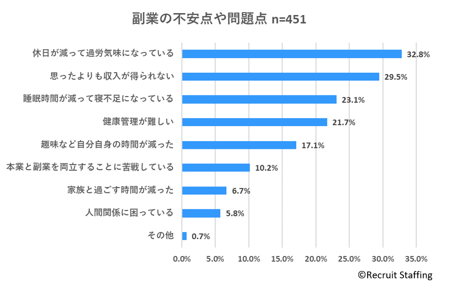 ■副業の不安・問題点は、「休日が減って過労気味になっている(32.8%)」、 「睡眠時間が減って寝不足になっている(23.1%)」など、労働時間が増えることによる健康面のマネジメントがあげられる。