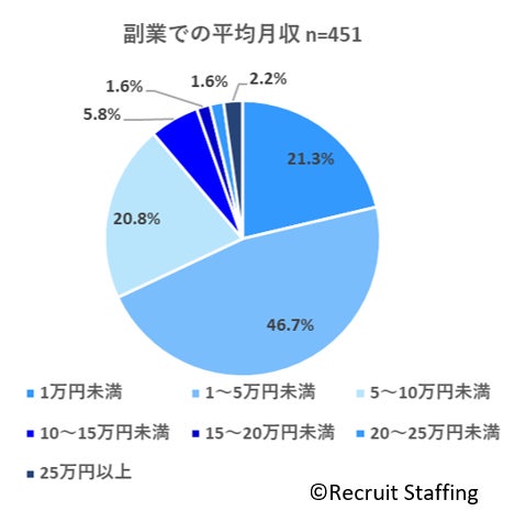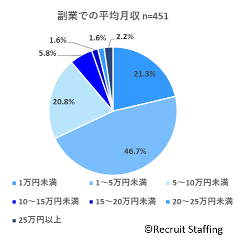 副業の実施数について聞いたところ、「1つ」と回答したのが72.7%、「2つ」と回答したのが21.3%、「3つ」と回答したのが4.0%となりました。副業の平均労働時間/週は、「5時間未満(38.6%)」、「5~10時間未満(31.7%)」と約7割の人が10時間未満の副業をしていることがわかりました。副業の労働時間が短い方が大半を占めたこともあり、平均月収については、「1~5万円未満」と回答した人が46.7%と最も多くなりました。