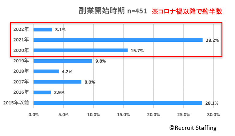 ■派遣スタッフの約3割が副業を経験。副業を開始した時期は、コロナ禍以降が約半数を占める。