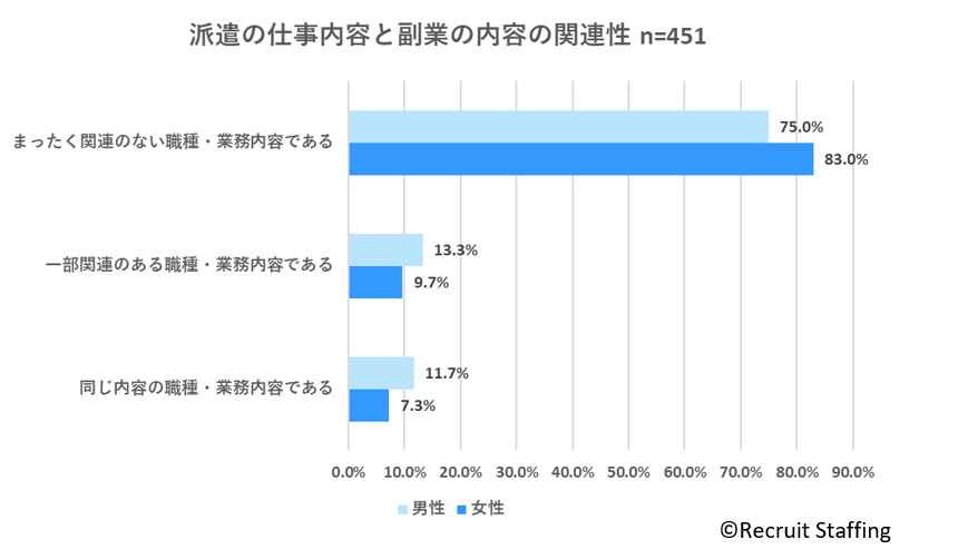 派遣の仕事と現在行っている副業の関連性については、「まったく関連のない職種・業務内容である」が男性75.0%、女性83.0%と、約8割にのぼりました。一方で、「一部関連のある職種・業務内容である」が男性13.3%、女性9.7%、「同じ内容の職種・業務内容である」が男性11.7%、女性7.3%と、派遣の仕事と副業の関連性が低い結果となりました。