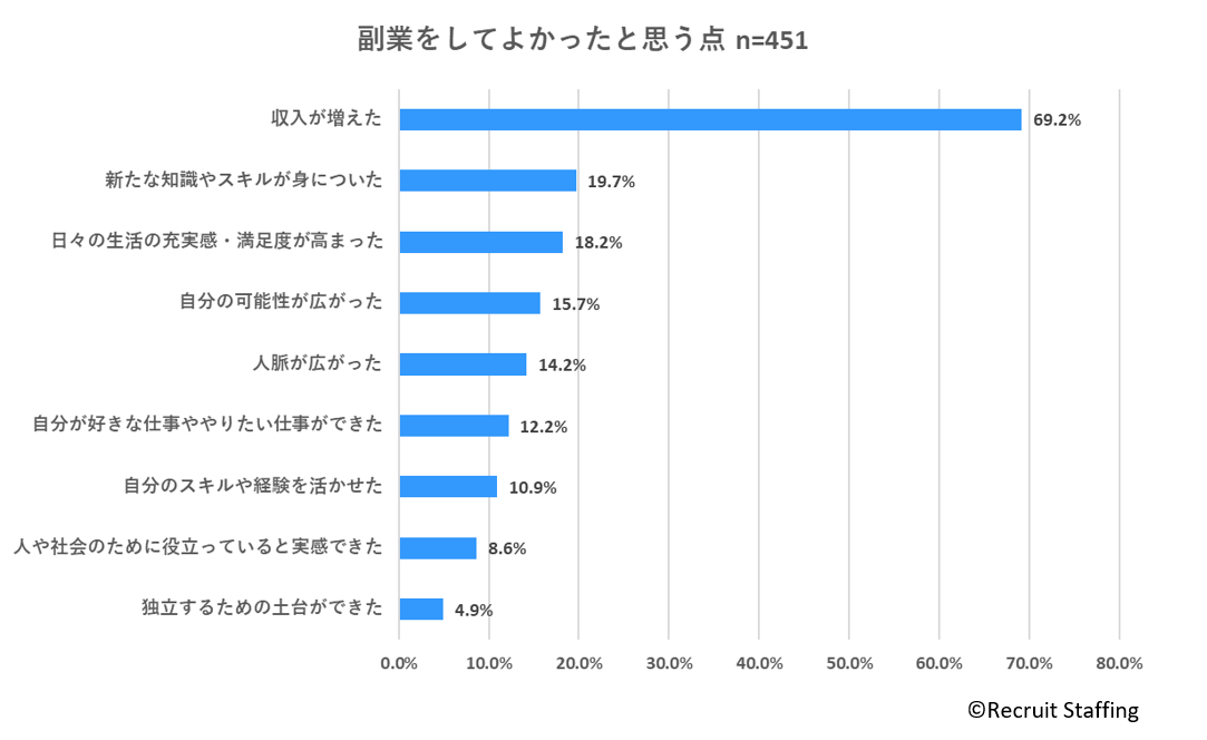■副業を行ってよかった点は「収入が増えた(69.2%)」が最も多い回答だったが、「新たな知識やスキルが身についた(19.7%)」、「日々の生活の充実感・満足度が高まった(18.2%)」など、収入以外のメリットも感じていることがうかがえる。