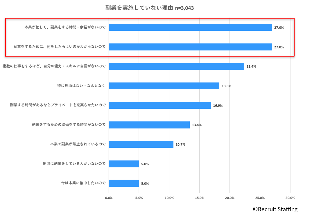 現在副業を行っていない理由については、「本業が忙しく、副業をする時間・余裕がない(27.0%)」、「副業をするために、何をしたらよいのかわからない(27.0)」との回答が最も多くあげられました。