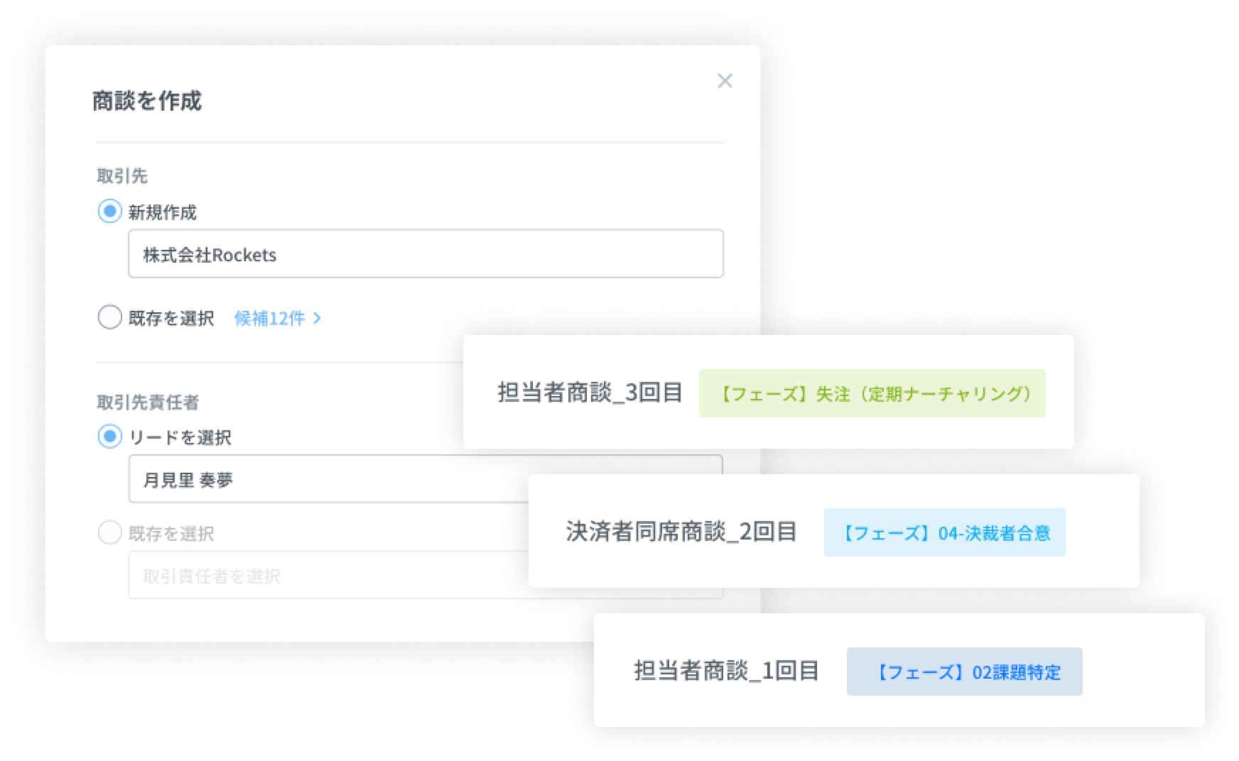 Salesforceの「商談」作成も、LEADPADにお任せください。連携ボタンを押して必要事項を入力するだけで、商談の情報も自動でSalesforceに反映されます。