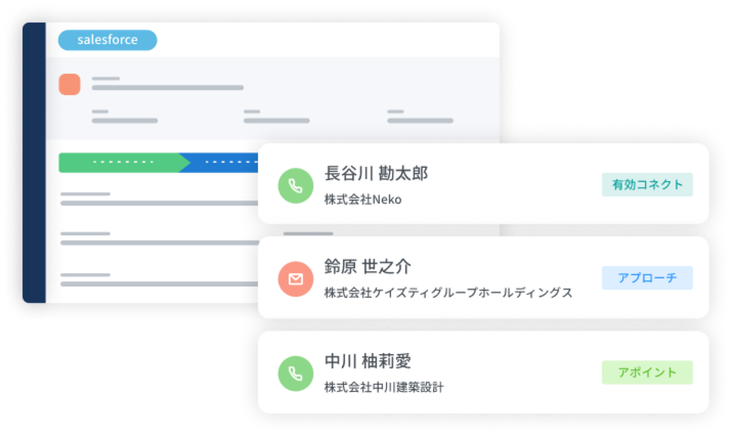 1時間毎に、LEADPADとSalesforceの自動連携を実現。Salesforce内の情報を常に取り込むことで、最新状況を把握し、フェーズに合わせた最適な営業アクションを実行できます。