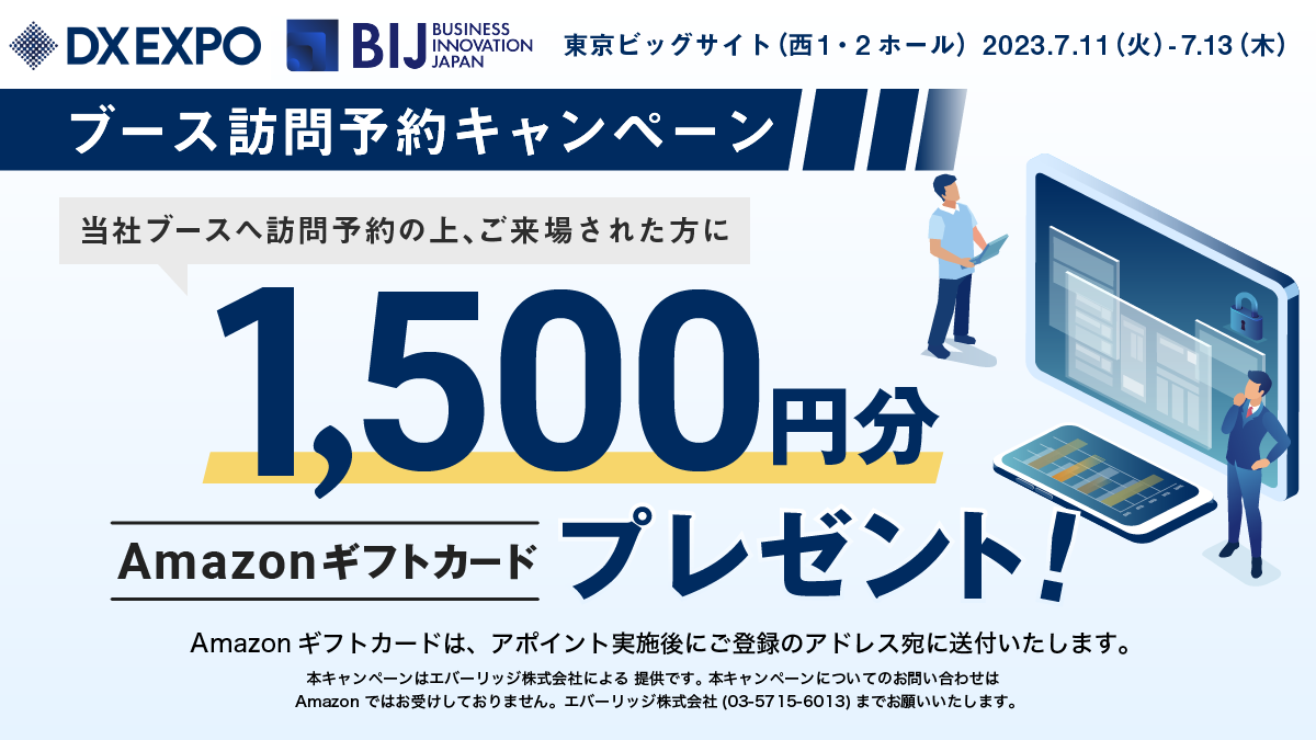 現在、弊社ブースへの訪問をご予約いただいたお客様に向けてキャンペーンを実施しております。プロモーションコード入力、当日のアポイント実施でAmazonギフトカード(1,500円分)をもれなく進呈します。ぜひ、訪問予約の上でご来場ください。