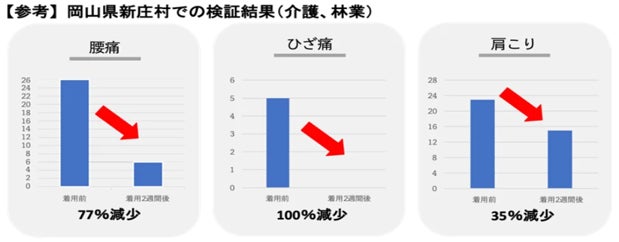 対象者に機能性シャツを着用してもらい、着用前・後の変化を計測しました。岡山県新庄村との実証実験では、2週間着用後に症状が改善されたという方が、肩こりで77%、ひざ痛で100%、肩こりで35%と高い効果を発揮しています。