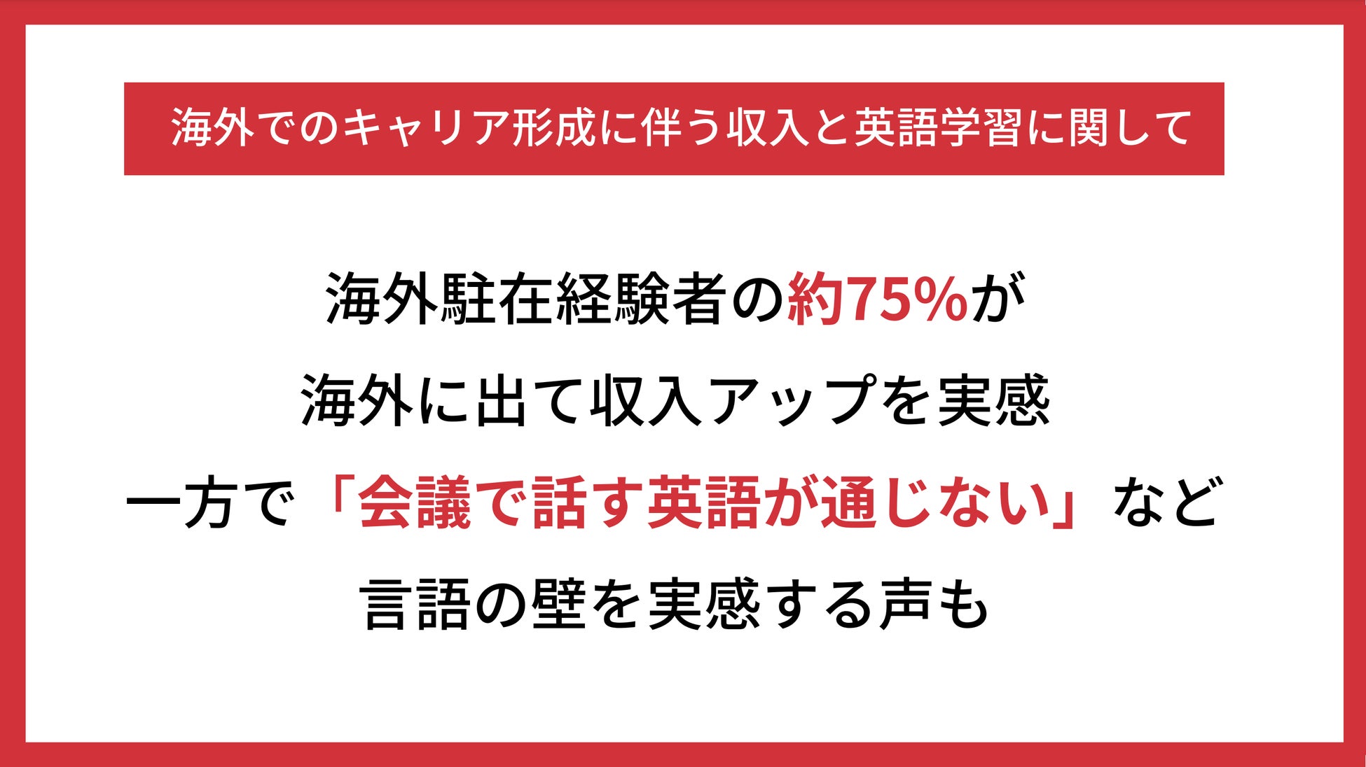 【海外駐在経験者107名に聞いた!】海外でのキャリア形成で約75%が収入アップを実感。一方で「会議で話す英語が通じない」など言語の壁を実感する声も。