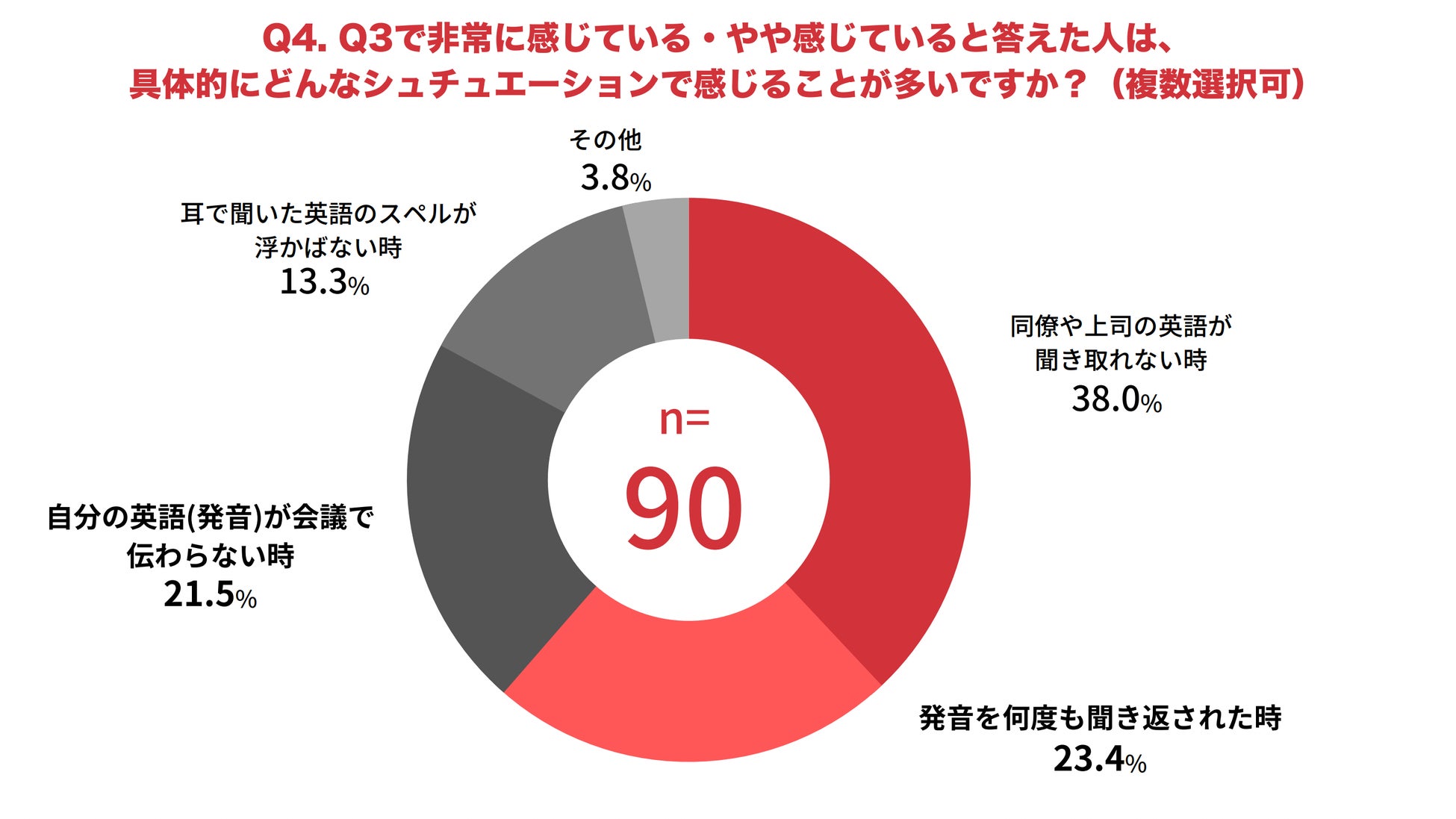 Q.3で「非常に感じている」「やや感じている」と回答した方に「Q.4 具体的にどんなシュチュエーションで感じることが多いですか?(複数選択可)」(n=90)と質問したところ、同僚や上司の英語が聞き取れない時が38.0%、発言を何度も聞き返された時が23.4%、自分の英語(発音)が会議で伝わらない時が21.5%という回答になりました。つまり、駐在経験者の44.9%が英語の発音が原因でコミュニケーションの難しさを感じたことがあることが分かりました。