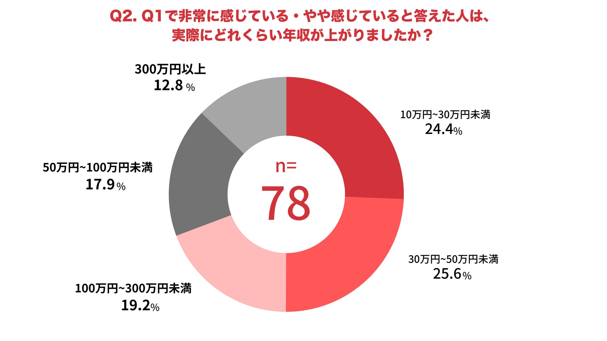 Q.1で「非常に感じている」「やや感じている」と回答した方に「Q.2 実際にどれくらい年収が上がりましたか?」(n=78)と質問したところ、50万円〜100万円未満が17.9%、100万円〜300万円未満が19.2%、300万円以上が12.8%という回答になりました。