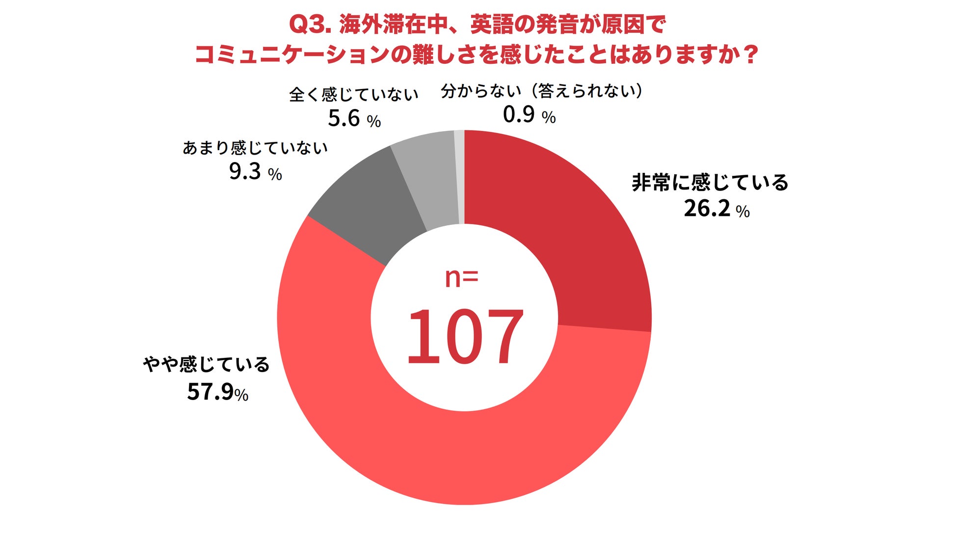 「Q.3 海外滞在中、英語の発音が原因でコミュニケーションの難しさを感じたことはありますか?」(n=107)と質問したところ、非常に感じているが26.2%、やや感じているが57.9%という回答になりました。