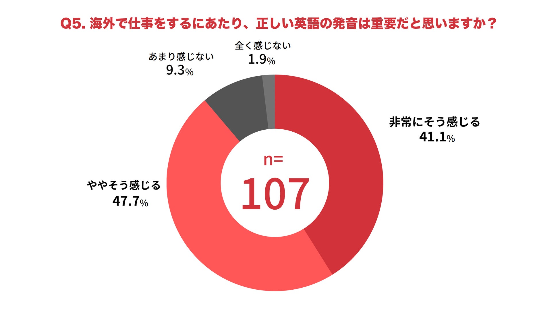 「Q.5 海外で仕事をするにあたり、正しい英語の発音は重要だと思いますか?」(n=107)と質問したところ、非常にそう感じるが41.1%、ややそう感じるが47.7%という回答になりました。