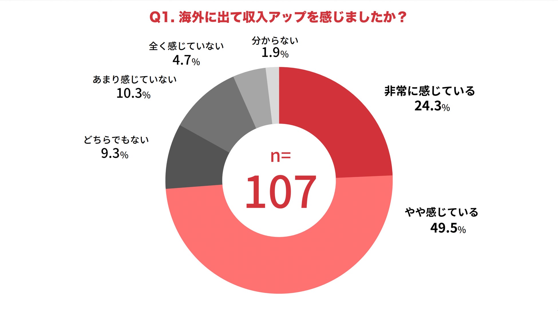 「Q.1 海外に出たことで収入アップを感じましたか?」(n=107)と質問したところ、非常に感じているが24.3%、やや感じているが49.5%という回答になりました。