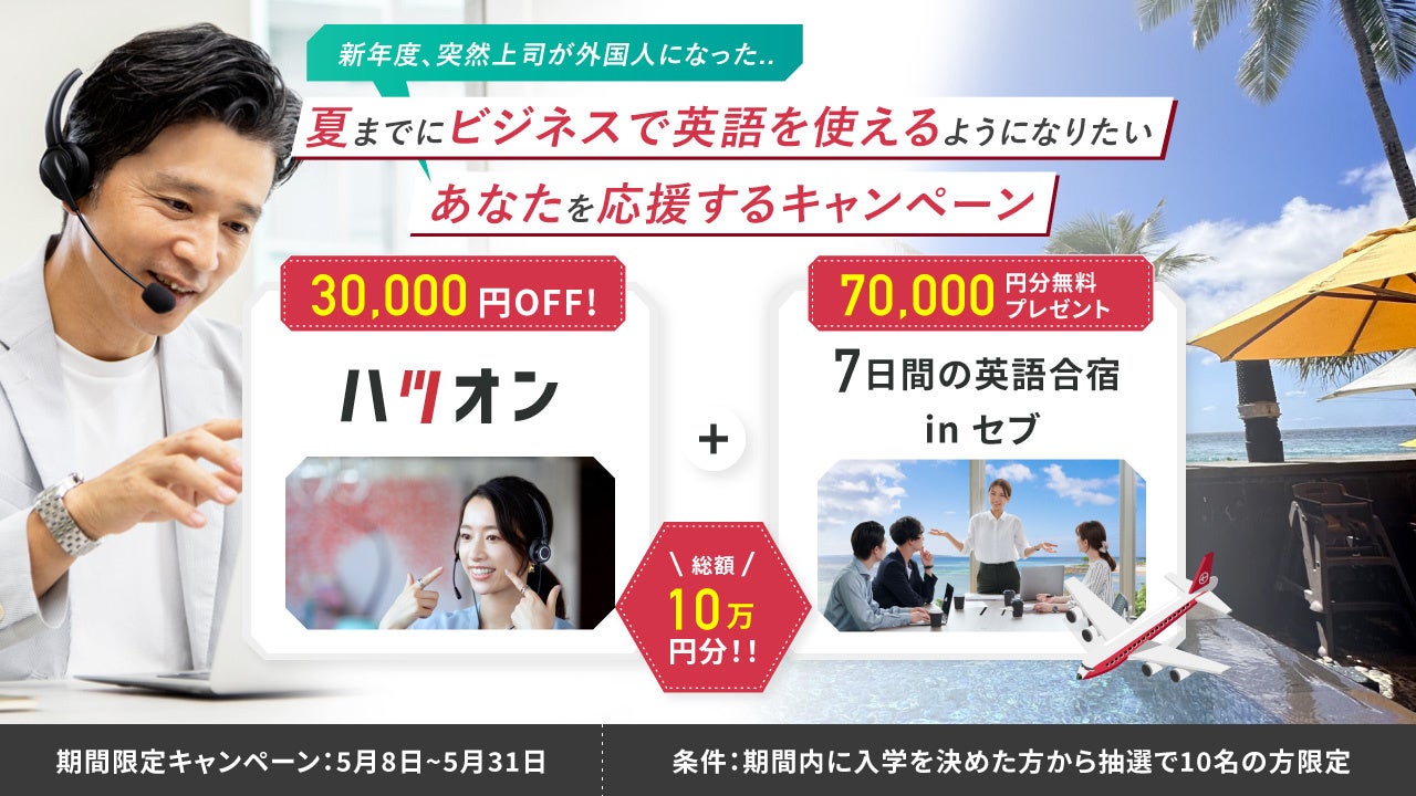 「夏までにビジネスで使える英語を身に付ける」をコンセプトに、5月中にハツオンにご入会いただいた方限定で10万円相当のプログラムが無料になるキャンペーンを実施いたします。プログラムの内容として、まずハツオンであなたのカタカナ英語をビジネスで伝わる英語へ変化させます。その上で、7日間のセブ現地での英語合宿にて、より実践的な英語を話す訓練を行い、プログラム終了後は実際のビジネス現場で伝わる英語を話せるようになることを目指します。