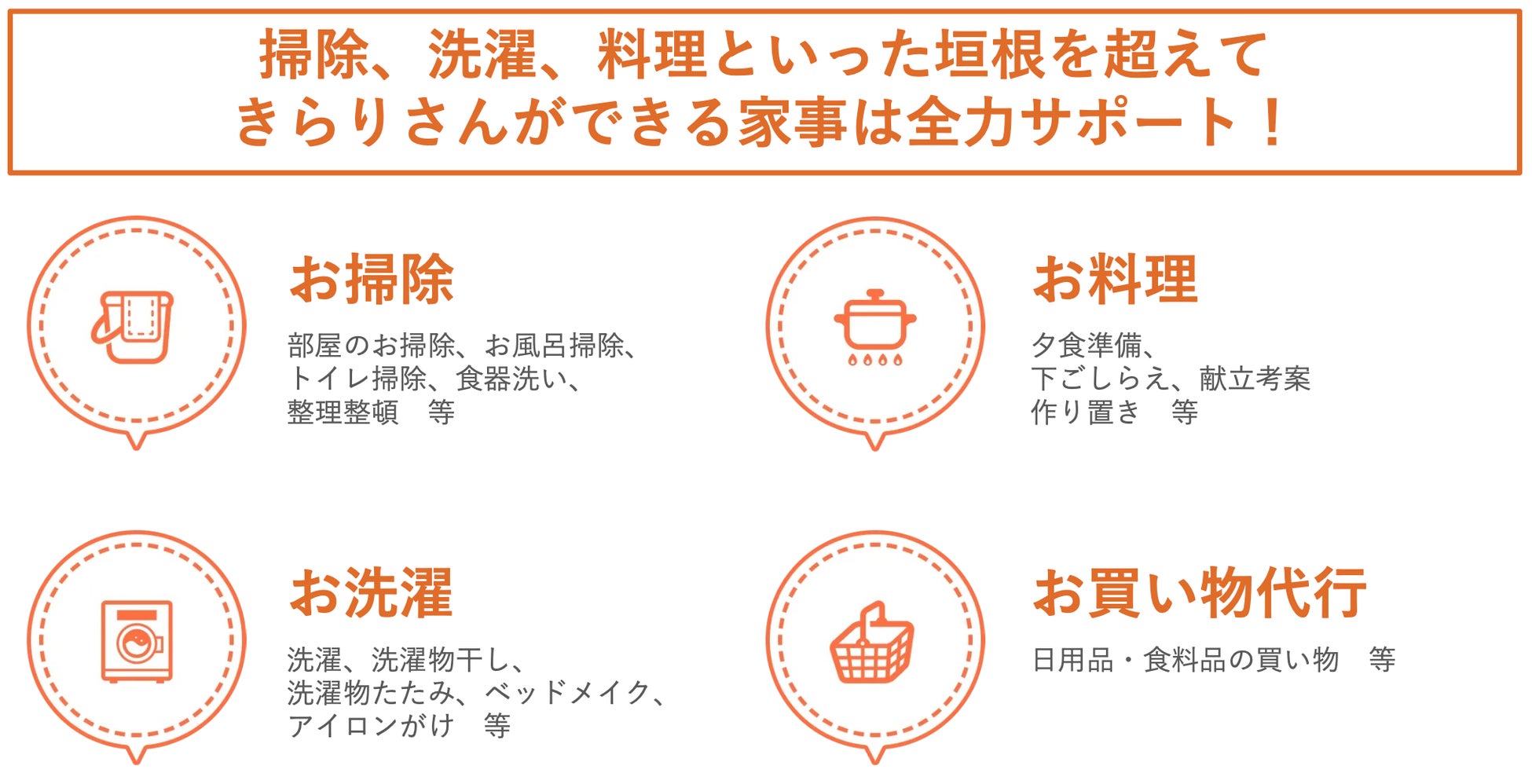 「家事支援サービス福利厚生導入実証事業」では家事サポートの提供に限ります。掃除、洗濯、料理といった垣根を超えて、きらりさんができる家事は全力でサポートいたします。