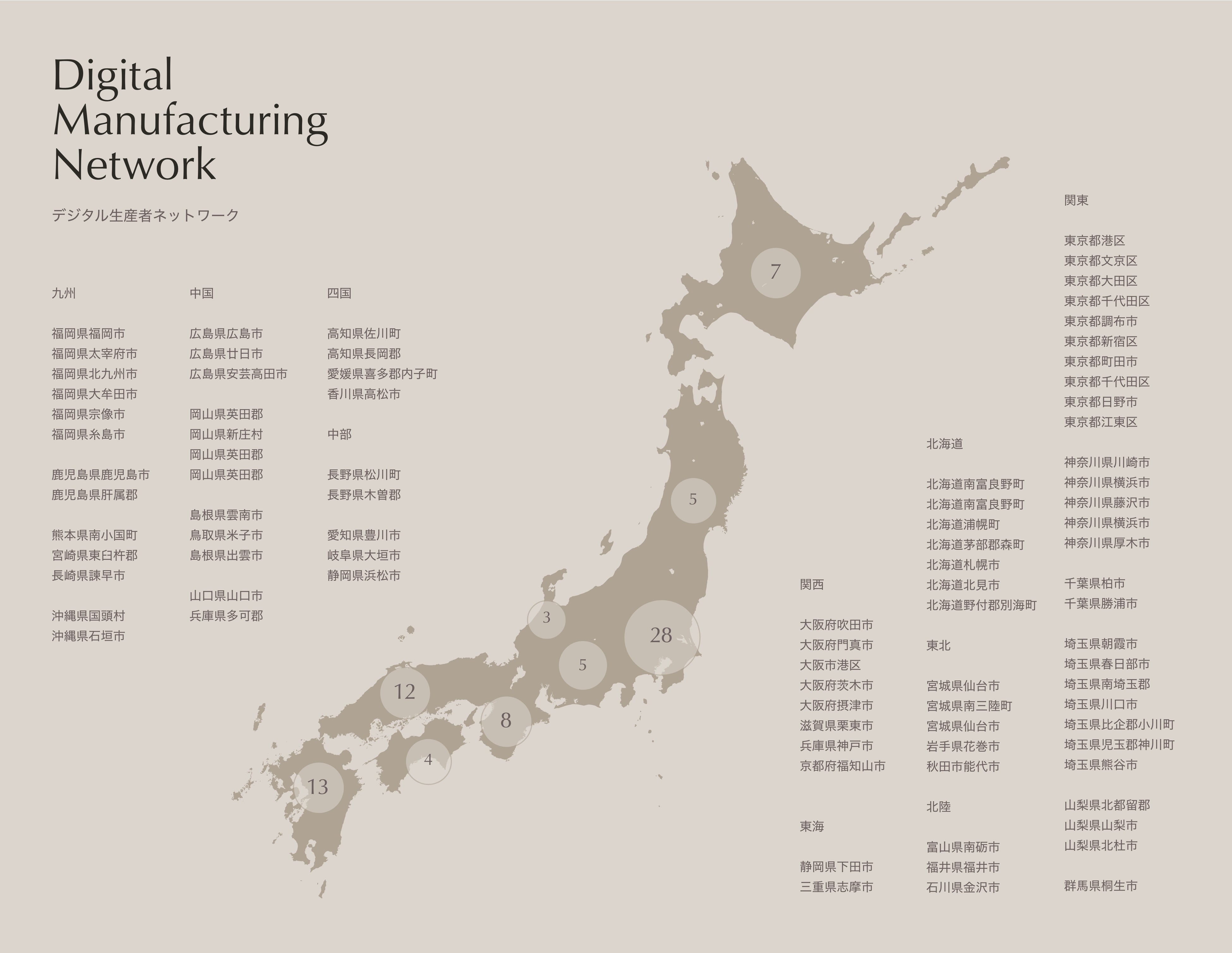 NESTINGの運営会社であるVUILDは、2017年に創業して以来、森林資源が豊富な日本各地に、木材の3D加工機「ShopBot」の導入を行ってきました。今では、100を超える場所にShopBotが導入され、データさえあればどの地域でも木材をデジタル加工できる環境が整っています。このような自律分散型の生産ネットワークを活用し、地域の木材を地域で活用することを推進していきます。