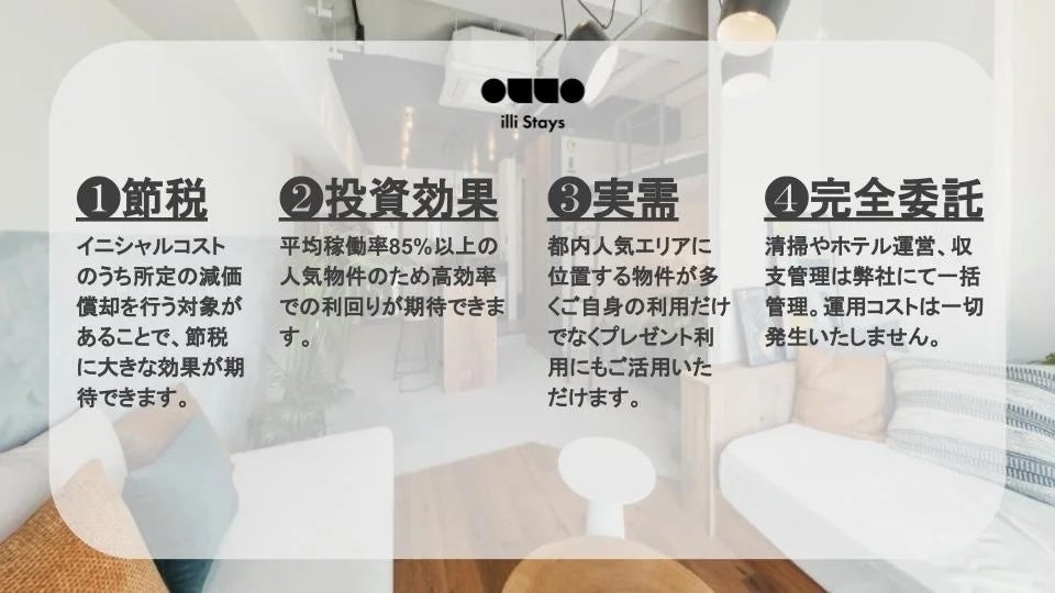 観光産業は世界に誇れる立派な産業となり得る大きな可能性を秘めており、同時に、時代や社会ニーズとのズレから稼働率や収益率が低下し、活躍し切れていない不動産を我々が大切にしているilli Staysに再生させることで、日本の不動産課題の解決にも貢献できる国益に資する事業であると強く思っております。