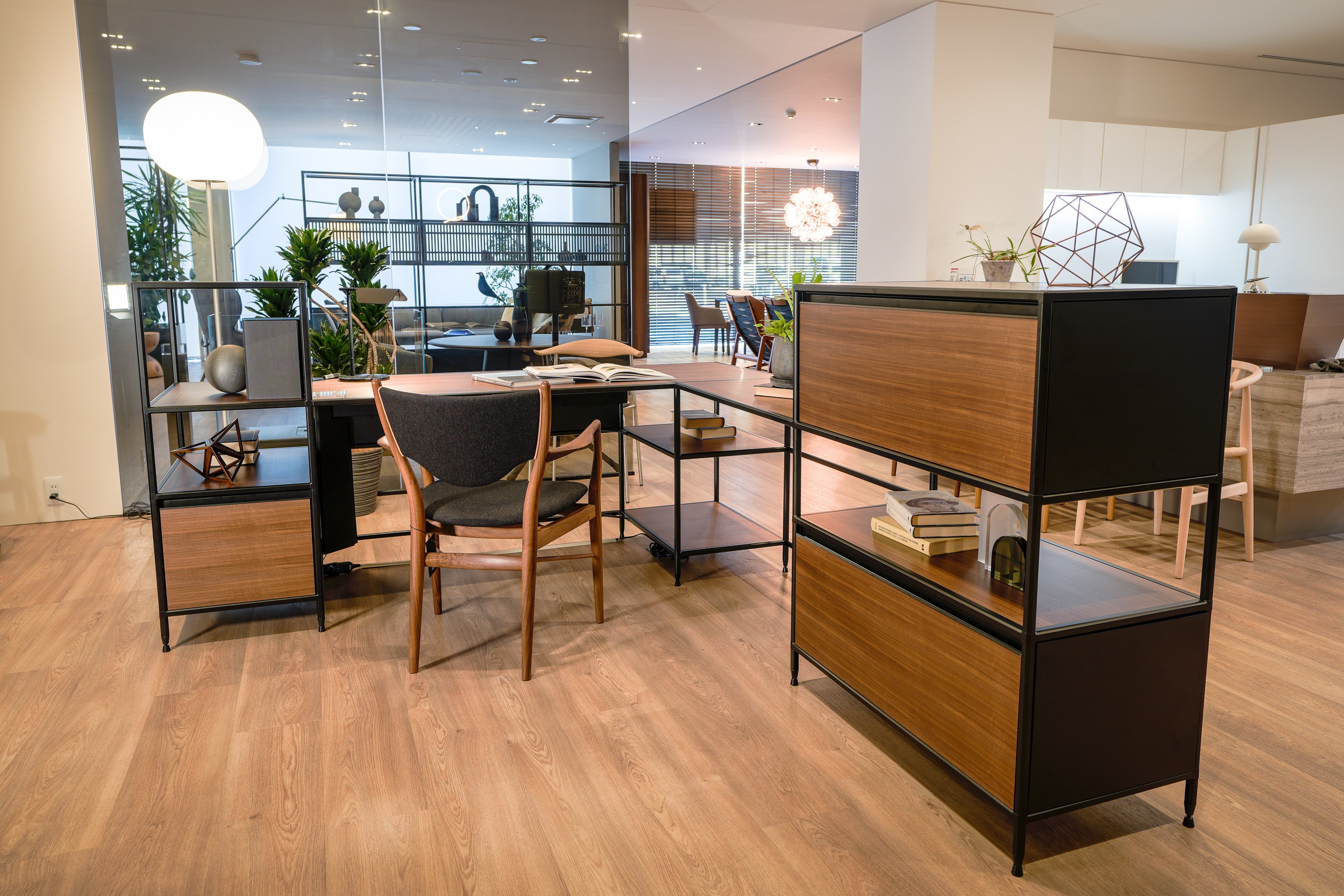 さまざまな長さのフレームを組み合わせ、板材や引き出しなどを組み込み、シェルフやデスク、リビングテーブルなど多種多様な形状を作ることができる家具の総称です。