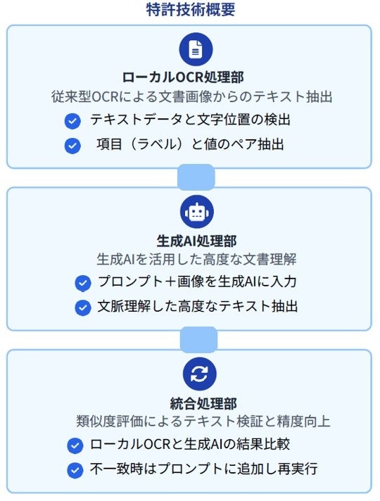 今回取得した「文書画像処理システム」特許は、従来のOCRと生成AIを組み合わせ、両者の結果を相互に検証・補完することで高精度な文字認識を実現します。