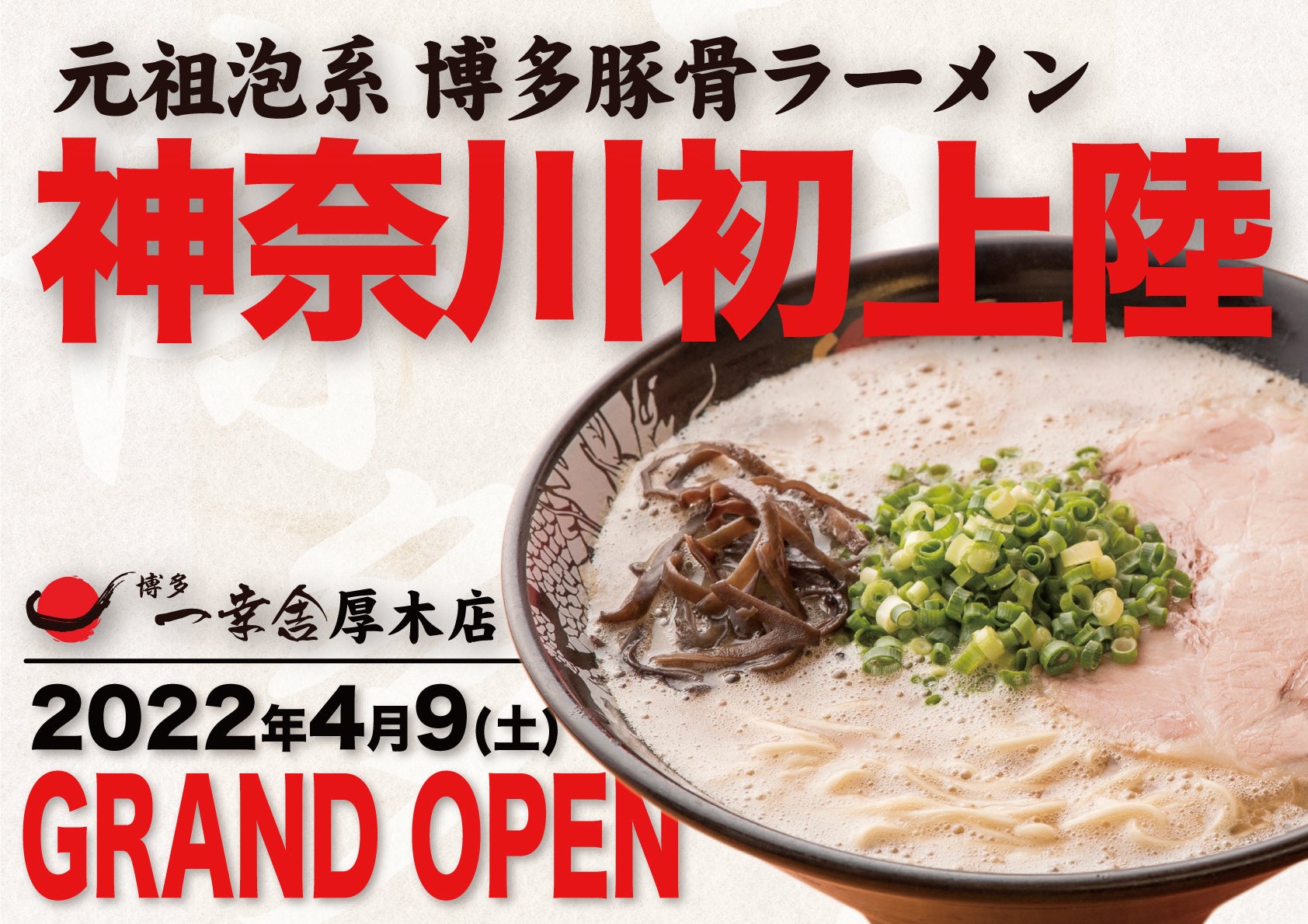 株式会社ウインズジャパンホールディングス (本社:福岡市博多区、代表取締役:吉村幸助)が運営する、本場博多の豚骨ラーメン店「博多一幸舎」は、神奈川県初出店となる『博多一幸舎 厚木店』を2022年4月9日(土)グランドオープンいたします。
