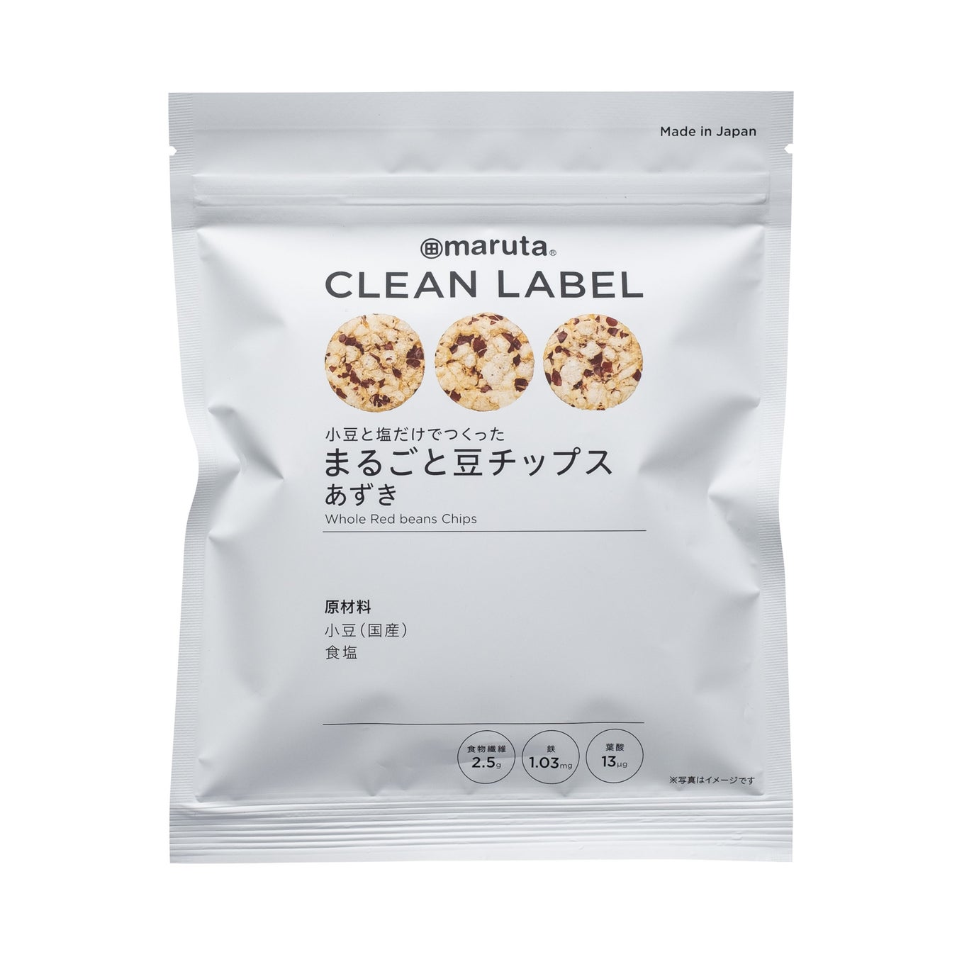 小豆と塩だけで作ったチップスです。小豆に含まれる栄養素をぎゅっと閉じ込めました。持ち運びに便利なチャック付きです。