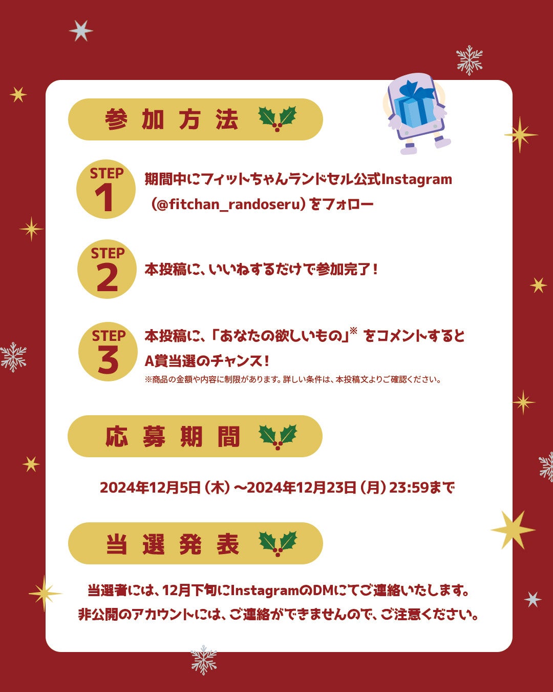 ランドセル国内製造販売本数No.1ブランド※「フィットちゃん」を製造・販売するランドセルメーカーの株式会社ハシモト(富山市北新町1丁目2番25号、代表取締役 橋本昌樹)は、フィットちゃんランドセル公式Instagramにて、「好きなものあげちゃう!クリスマスプレゼントキャンペーン」を開催いたします。