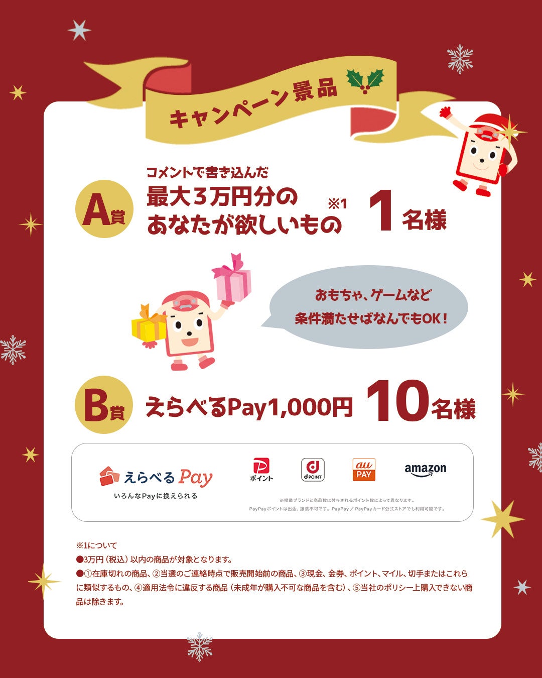 クリスマスプレゼントとして、コメントで記載いただいた「最大3万円分の欲しいもの※1」や、お好きなポイントなどにして使用できる「えらべるPay 1,000円分」を総勢11名様にプレゼントいたします。