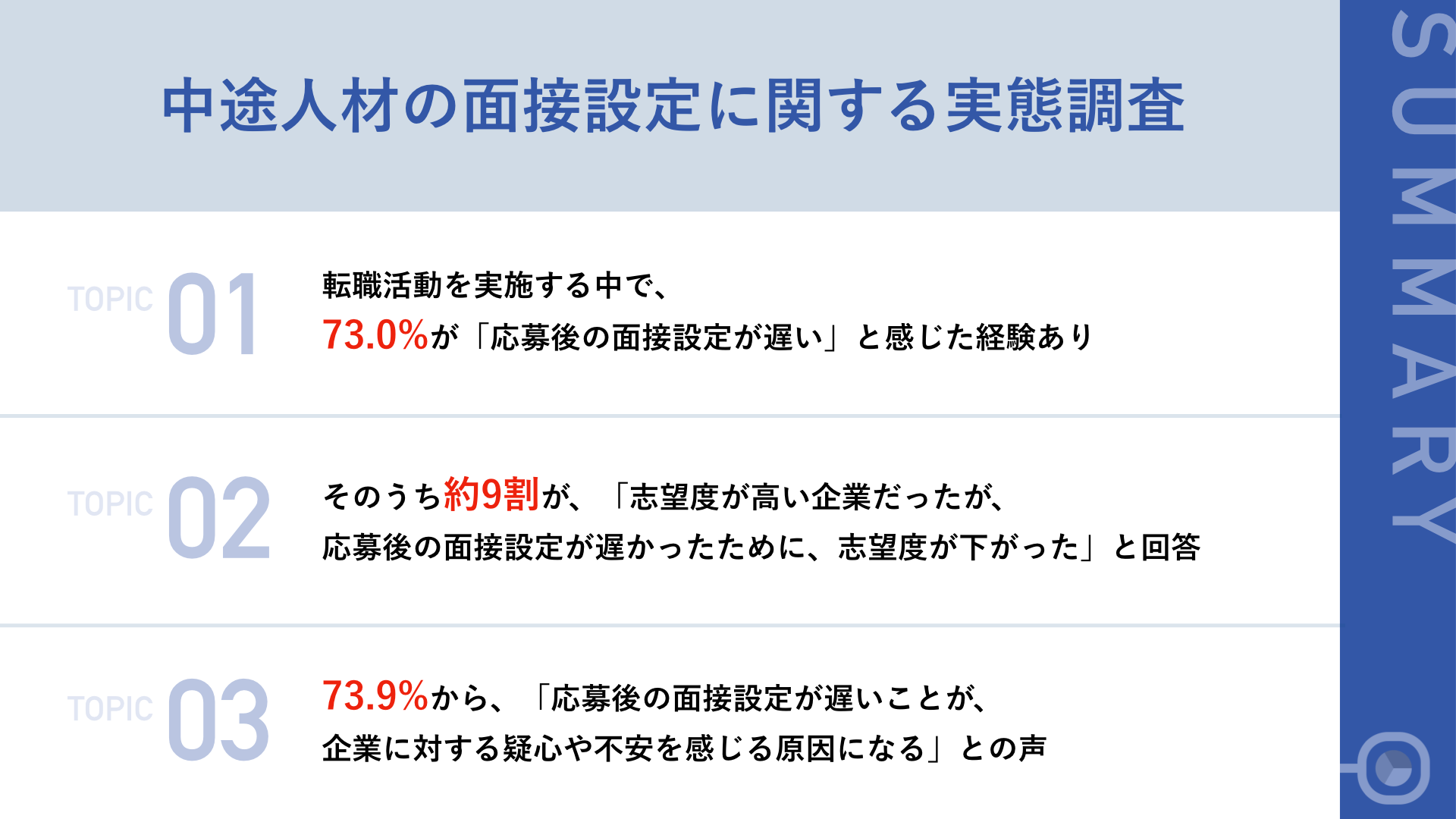 - 転職活動中に、7割以上が「応募後の面接設定が遅いと感じたことがある」と回答