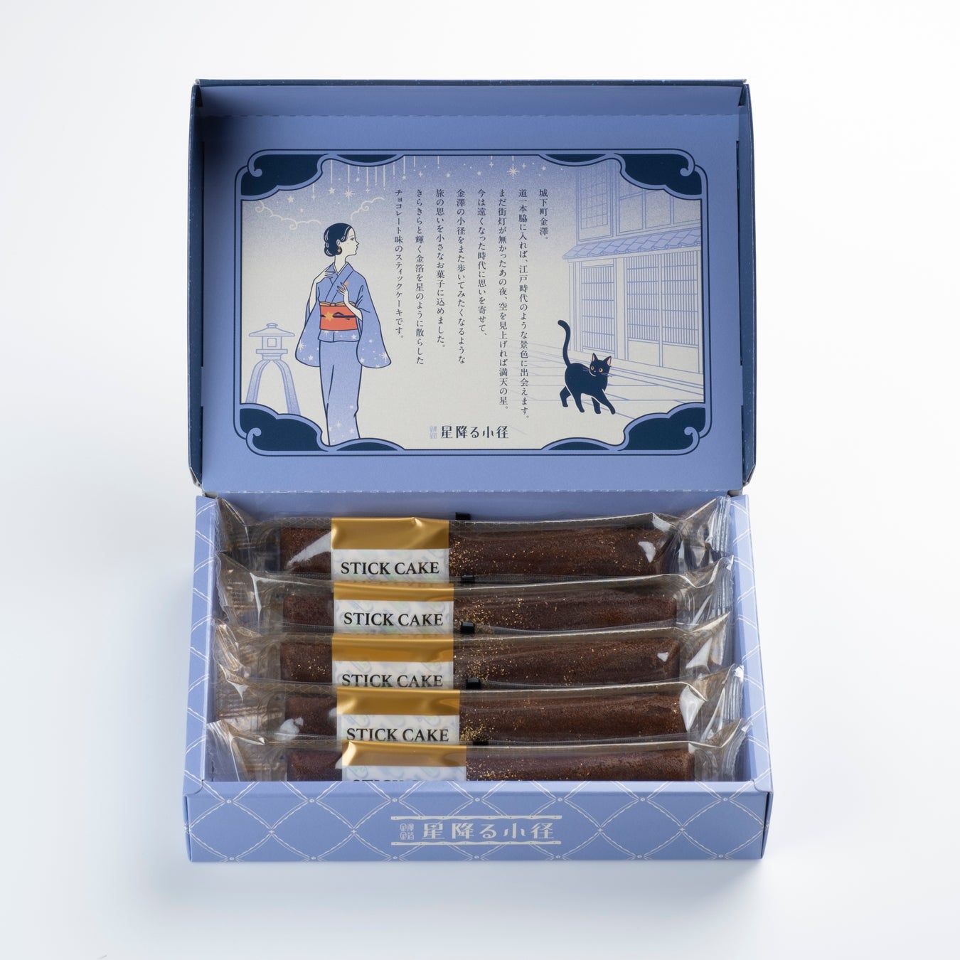 今は遠くなった時代に思いを寄せて、金澤の小径をまた歩いてみたくなるような旅の思いを小さなお菓子に込めました。きらきらと輝く金箔を星のように散らしたチョコスティックケーキです。