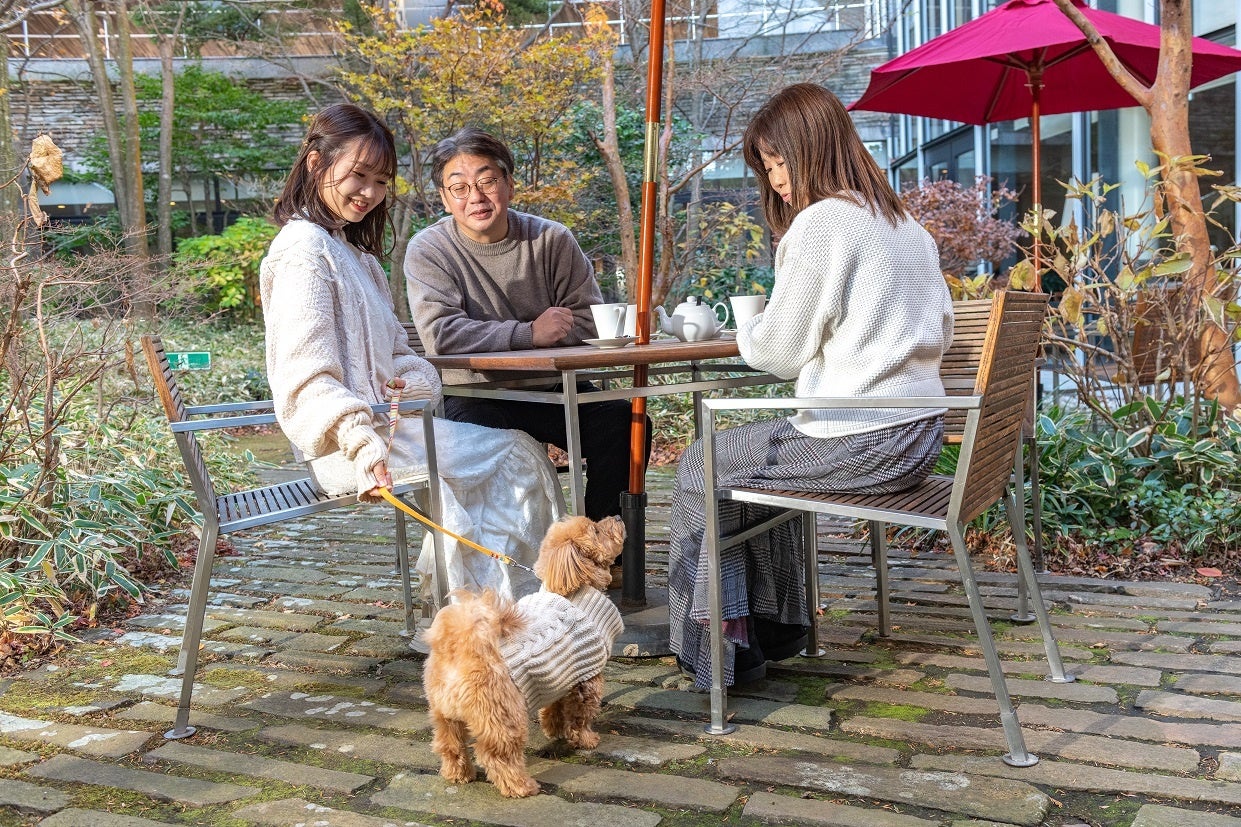 中庭にあるテラス席は、ドッグ同伴でご利用いただけます。開放的な空間でティータイムをお楽しみください。