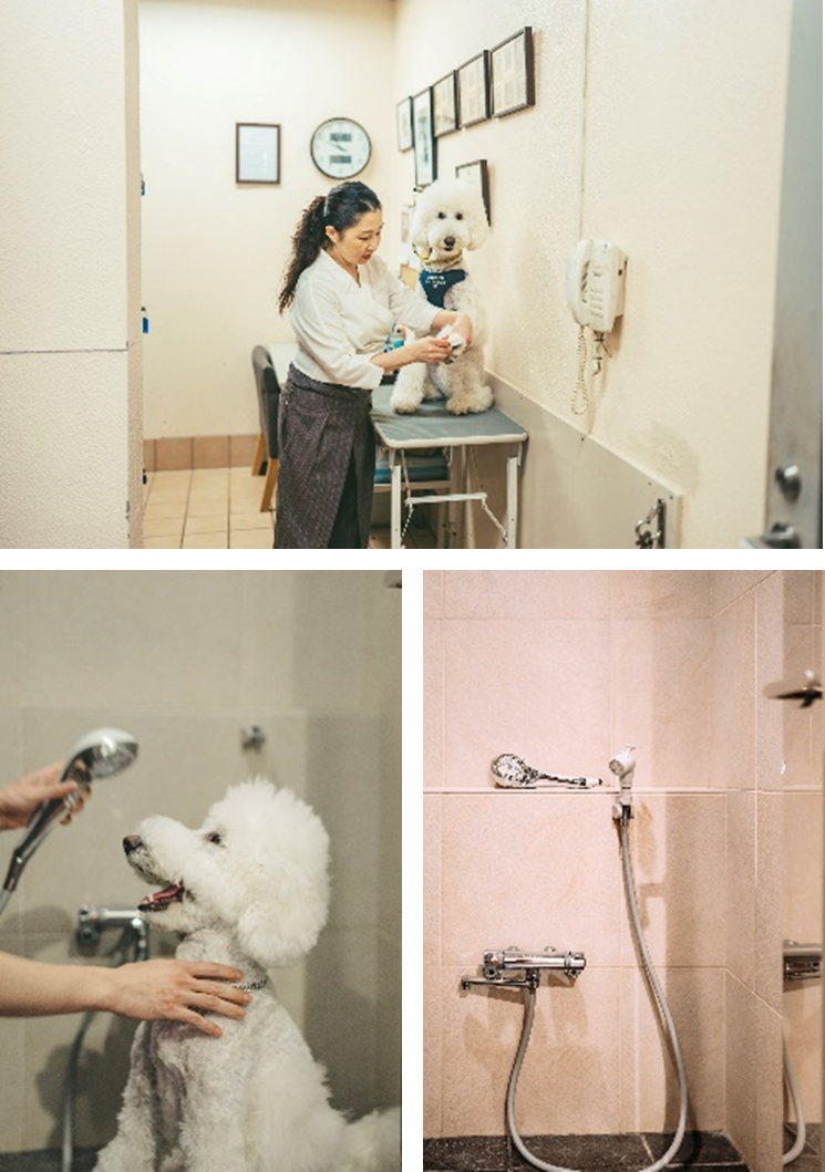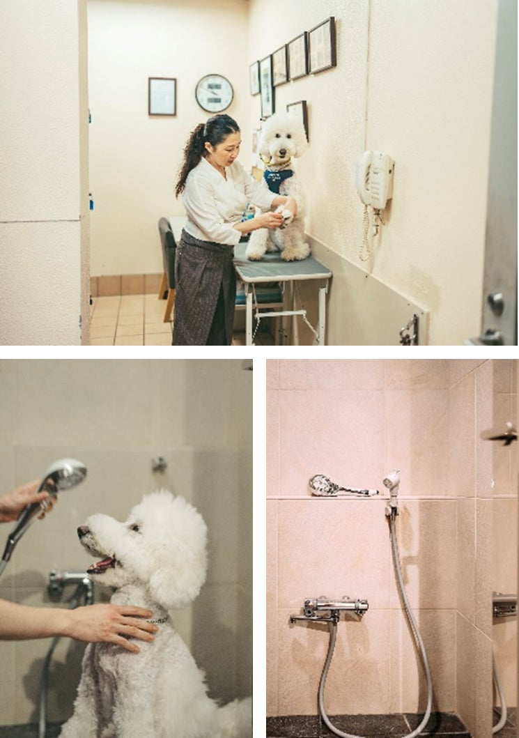 人の赤ちゃんのように繊細な犬の肌にも健やかにやさしく洗い上げてくれるシャワーは、ワンちゃんにとっての贅沢な「スキンケア」タイムです。ご滞在中、飼い主さんとの良好なコミュニケーションツールとしてお役立てください。専用シャンプーには、純植物性のドッグ用シャンプーをご用意しています。また、ドッグ用アメニティには、ブラッシングスプレー、ウェットティッシュ、トイレシートもご用意しています。